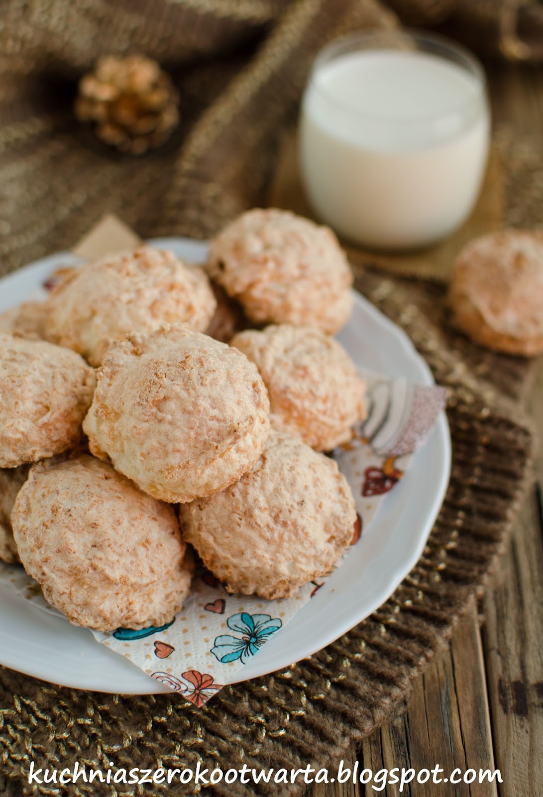 Do białek dodać szczyptę soli. Ubijać mikserem na średnich obrotach. Kiedy białka podwoją swoją objętość stopniowo dosypywać cukier. Ubijać do czasu, aż piana będzie szklista i sztywna. Do piany dodać wiórki kokosowe i mąkę. Delikatnie wymieszać całość do połączenia się składników. Blaszkę wyłożyć papierem do pieczenia. Nakładać (najlepiej za pomocą łyżki do lodów) porcje ciasta, zachowując większe odstępy. Wstawić do nagrzanego do 170 stopni piekarnika i piec ok. 20 minut, do lekkiego zarumienienia.