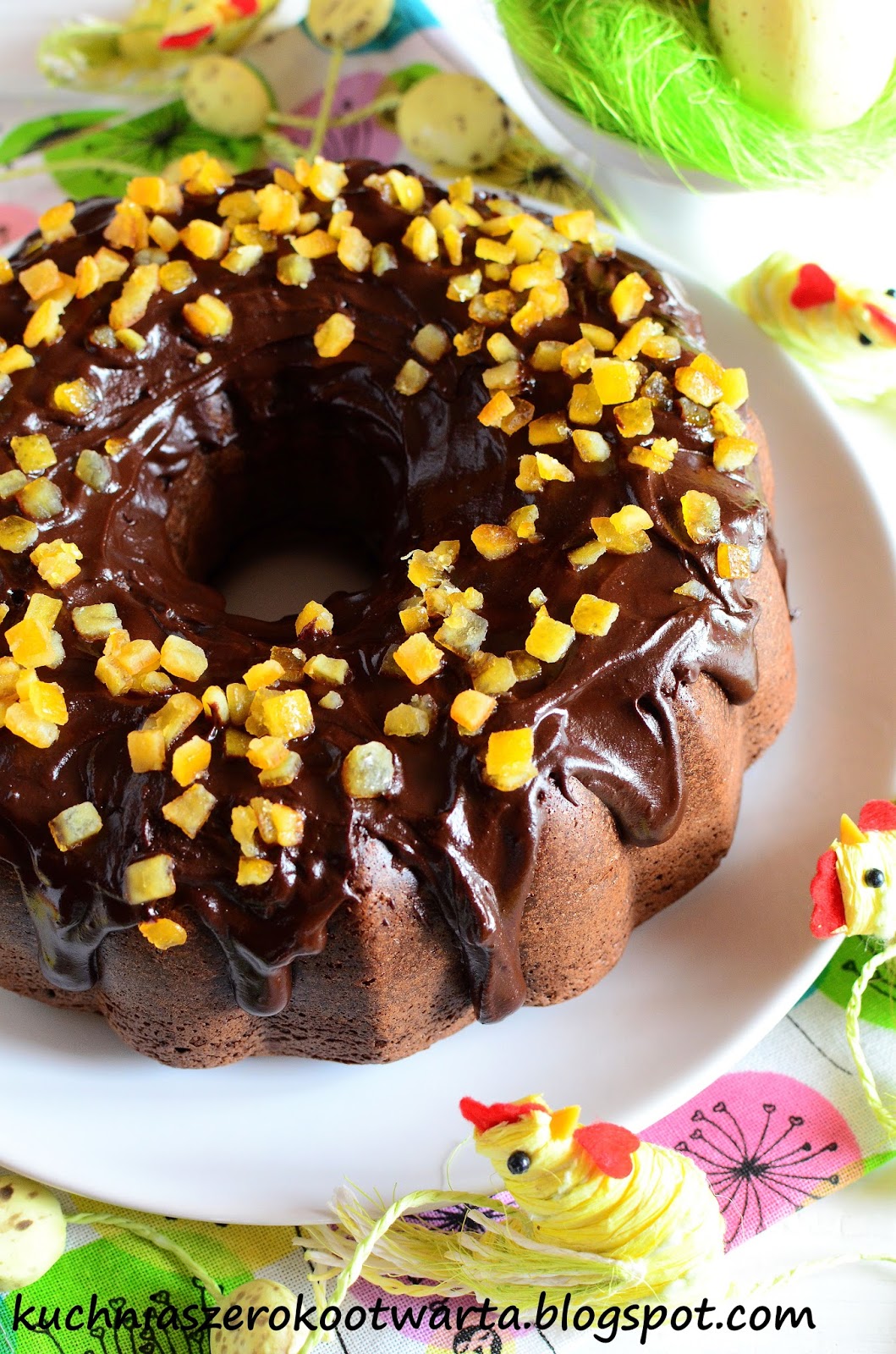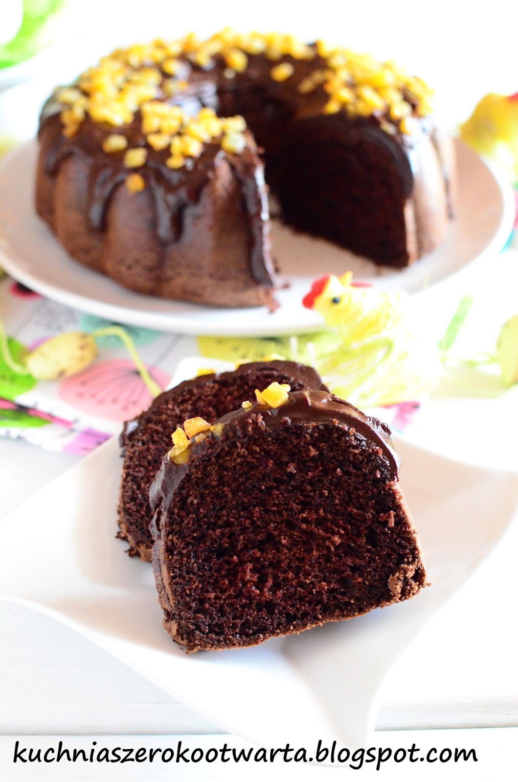 Polewa: Czekolady, mleko i masło rozpuścić w kąpieli wodnej. Polewą polać ciepłą babkę. Posypać kandyzowaną skórką pomarańczową. Smacznego!