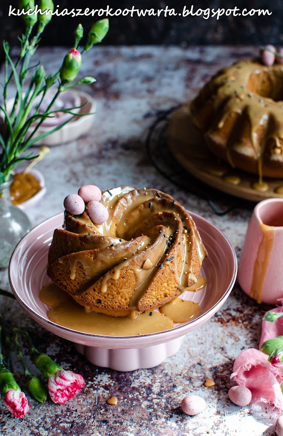 Pyszne, puszysta babka kajmakowa z boską polewą z masy krówkowej i czekolady 🙂 Idealnie sprawdzi się na Wielkanocnym stole. Zrobisz ją ekspresowo z zaledwie kilku składników 🙂 Możesz upiec ją w tradycyjnej formie do babki, keksówce lub w formie małych babeczek np. do koszyczka. Słodkich świąt 🙂