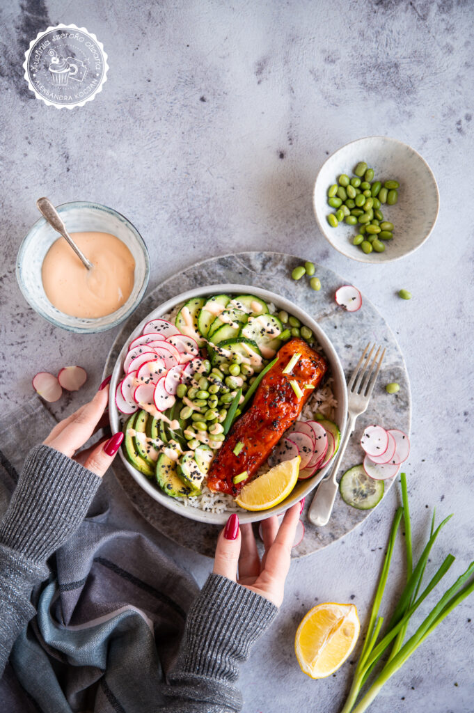 Kolorowy, pełnowartościowy i sycący bowl z pstrągiem, awokado i edamame to pyszny posiłek, który przygotujesz w kilka chwil.  Taka miska zdrowia to prawdziwa bomba witaminowa. Bajecznie dobry pstrąg zapieczony w sosie teriyaki, chrupiące warzywa i dodatek ryżu dla sytości to posiłek, który możesz zabrać ze sobą do pracy lub przygotować na szybki obiad. Całość dopełnia kremowy, słodko-ostry sos sriracha majo, który idealnie współgra z pozostałymi składnikami.