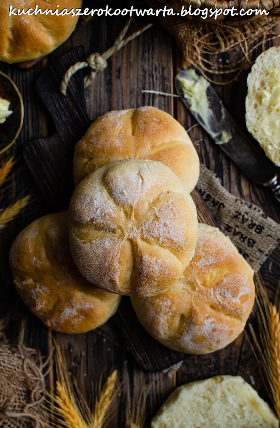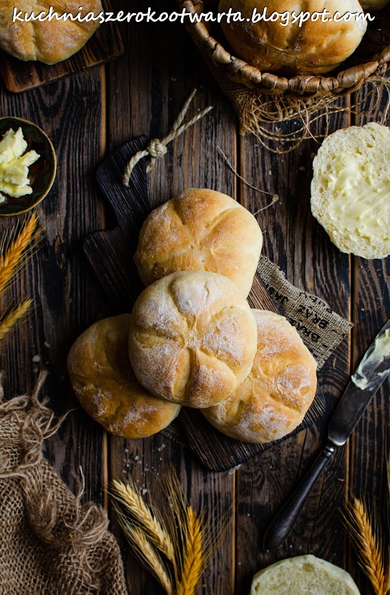 Do ciepłej wody dodać pokruszone drożdże, cukier i łyżkę mąki. Wymieszać, do rozpuszczenia drożdży i pozostawić do podrośnięcia na około 10 minut. Mąkę przesypać do miski, dodać sól, rozkłócone jajko, podrośnięty zaczyn i wyrabiając, stopniowo dolewać rozpuszczone masło. Ciasto zagniatać (ręcznie, w robocie lub automacie do wypieku chleba), do czasu, aż będzie miękkie, elastyczne i łatwo będzie odchodzić do miski/naczynia. W przypadku wyrabiania ciasta ręcznie lub w robocie miskę z ciastem przykryć ściereczką i odstawić do podrośnięcia w ciepłe miejsce na około 1 godzinę. Podrośnięte ciasto przełożyć na stolnicę wysypaną mąką, krótko zagnieść i podzielić na 12 równych części (każda po około 73 g). Każdą porcję ciasta lekko spłaszczyć, brzegi zawinąć do środka i uformować kulkę. Przełożyć na papier do pieczenia zlepieniami do dołu. Bułki oprószyć mąką i lekko spłaszczyć dłonią. W każdej bułce ostrym nożykiem zrobić 5 dość głębokich nacięć od środka do zewnątrz. Blaszkę przykryć ściereczką i odstawić bułki do podrośnięcia na około 10 minut. Bułki spryskać wodą najlepiej za pomocą spryskiwacza i wstawić do nagrzanego do 190 stopni piekarnika (grzałka góra-dół) na około 20-22 minuty, aż bułki ładnie się zarumienią. Na 5 minut przed końcem pieczenia można włączyć funkcję termoobieg. Bułki wyjąć i wystudzić na kratce. Smacznego!