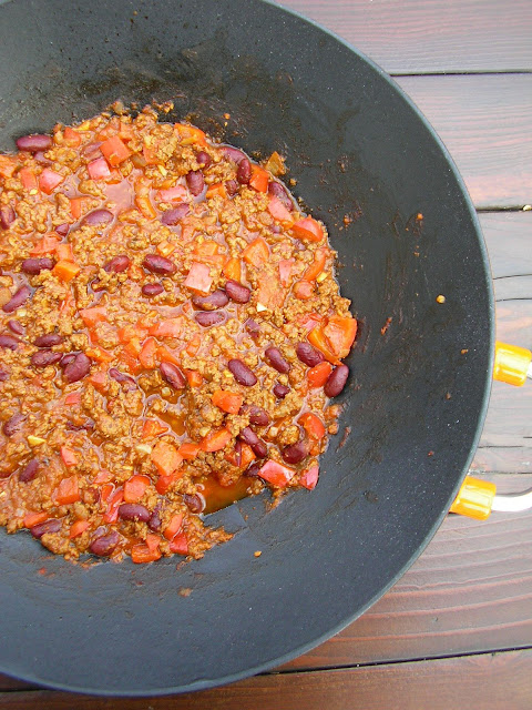 W dużym naczyniu podgrzać oliwę. Dodać pokrojoną w kostkę cebulę, posiekany czosnek, kumin oraz chili. Chwilę podsmażyć, nie doprowadzając do zrumienienia się czosnku. Dodać wołowinę i smażyć do miękkości. Dodać pomidory z puszki i bulion wołowy. Dusić około 20 minut do zredukowania się płynu i zagęszczenia. Dorzucić pokrojoną w kostkę paprykę i chwilę pogotować. Dodać odsączoną fasolę z puszki. Wymieszać do połączenia się składników. Pod koniec gotowania dodać czekoladę i wymieszać do rozpuszczenia. Podawać z ryżem, pieczywem, tortillą lub nachos.