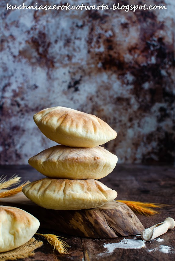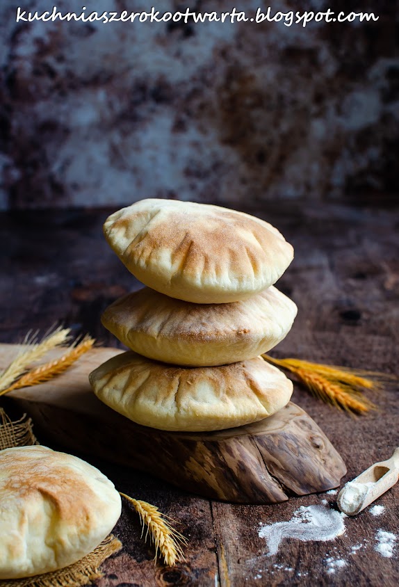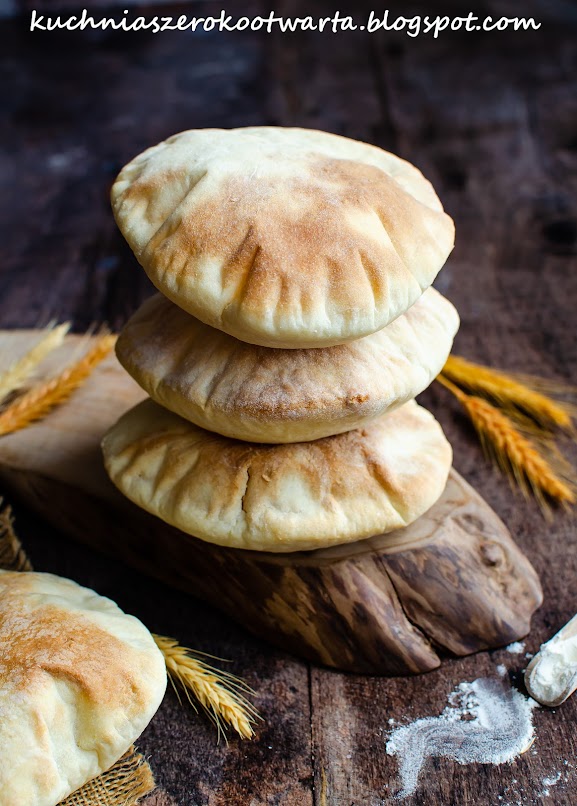 Domowe chlebki pita nie mają sobie równych. Takie świeżo upieczone smakują o niebo lepiej, niż te gotowe ze sklepu. To tylko kilka składników i niewiele pracy. Możecie nadziać je dowolnymi składnikami, a ja niebawem pokażę Wam jedną z pysznych propozycji na takie nadzienie 😉 Cały sekret dobrze wyrośniętych chlebków, z tzw. „kieszonką”, tkwi w odpowiednim wyrastaniu samego ciasta, następnie tego, uformowanego już w kulki oraz odpowiednio mocno nagrzanym piekarniku. Drugim sposobem na ich przygotowanie jest nagrzanie przed pieczeniem samej blaszki, na którą kładzie się rozwałkowane i ułożone na papierze do pieczenia chlebki. Ten wypiek bywa kapryśny, więc nawet jeśli chlebki w trakcie pieczenia nie napuszą się tak bajecznie, z powodzeniem możecie rozkroić je nożem i nadziać. Ważne jest wtedy, aby ciasto nie było rozwałkowane zbyt cienko 🙂
