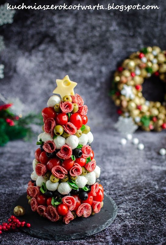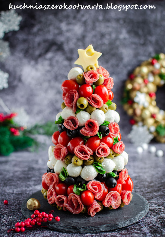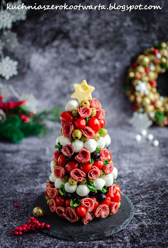 Choinkę obwinąć folią, wbić wykałaczki, umieszczając je w ok. 2 cm odstępach. Oliwki i mozzarellę odsączyć z zalewy i osuszyć na ręczniku papierowym. Nadziewać od dołu szereg zielonych oliwek, pomidorki, czarne oliwki i kulki mozzarelli. Plasterki salami złożyć na pół i zwinąć w różyczkę. Przymocować wykałaczkami między pozostałe składniki. Listki bazylii lub roszponki powciskać w wolne przestrzenie. Z sera żółtego wyciąć gwiazdę i zamocować ją na górze choinki. Smacznego!