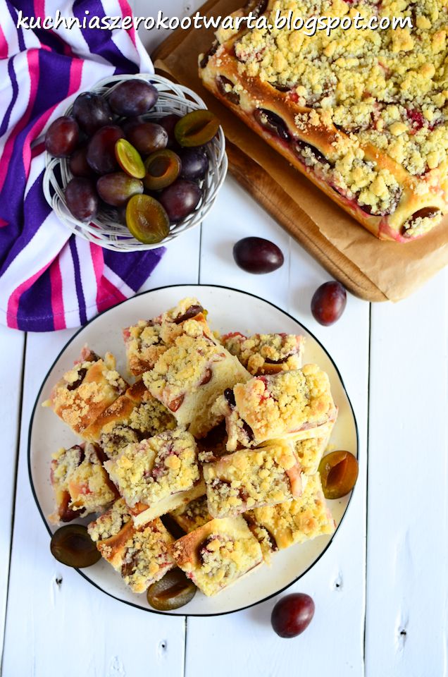 Z mąki z solą, masła i cukru zagnieść kruszonkę. Kruszonkę schłodzić w lodówce. Na wierzchu ciasta poukładać połówki śliwek skórkami do dołu. Śliwki posypać przygotowaną kruszonką. Ciasto wstawić do nagrzanego do 180 stopni piekarnika (dolna grzałka) na ok. 40 minut. Przed końcem pieczenia można włączyć grzałkę góra-dół, aby kruszonka się zrumieniła. Przed wyciągnięciem z piekarnika sprawić czy ciasto się upiekło za pomocą patyczka.