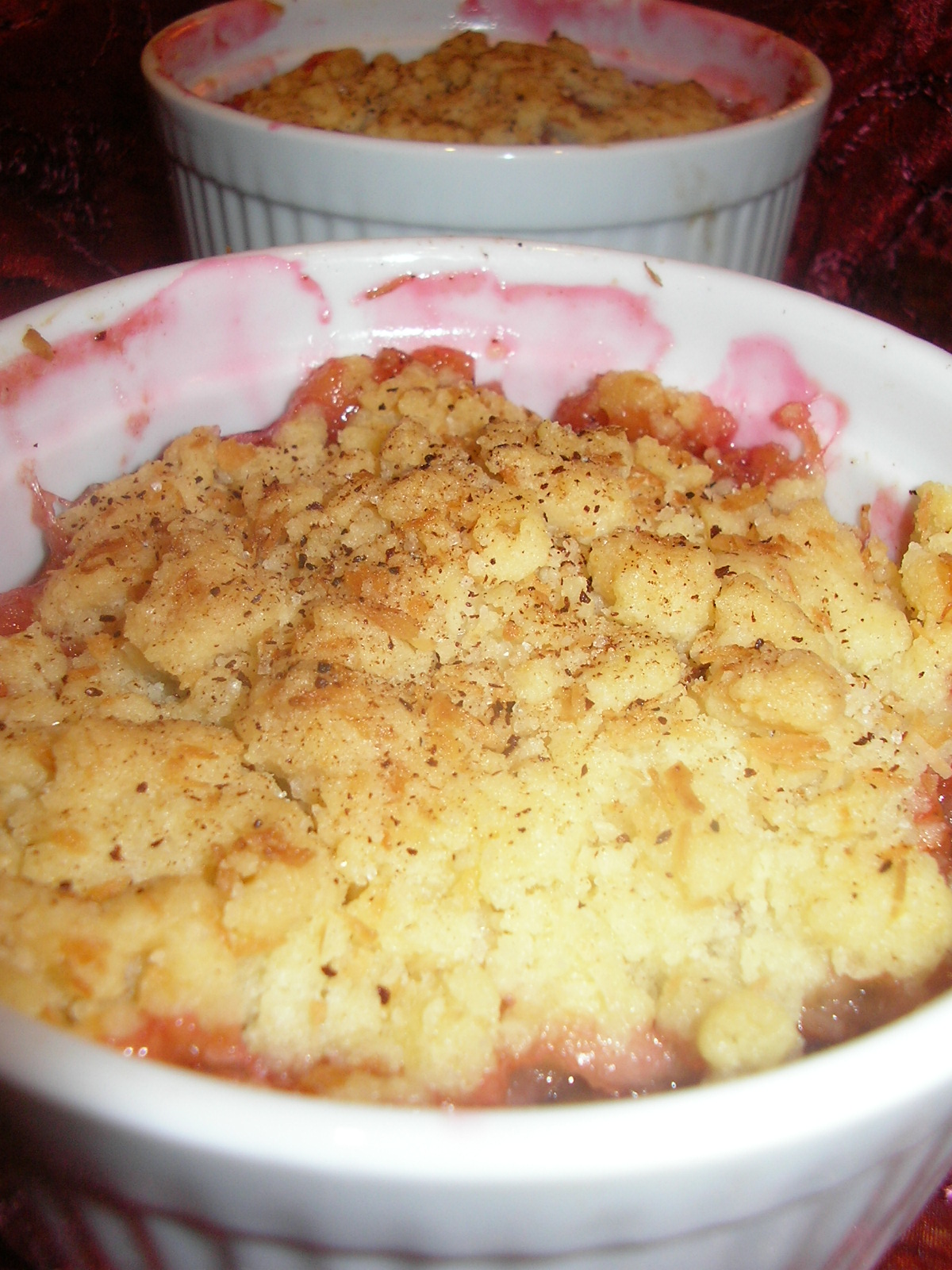 Jabłka i śliwki oczyścić i podsmażyć przez chwilę na łyżce masła. Zasypać cukrem i wymieszać. Owoce przełożyć do kokilek i posypać, mąką i cynamonem. Z mąki, masła i cukru oraz cukru z wanilią zagnieść sypką kruszonkę. Kruszonką posypać wierzch owoców. Crumble włożyć do nagrzanego do 180 stopni piekarnika i piec około 30-40 minut, do czasu upieczenia i zarumienienia się kruszonki. Podawać ciepłe z kleksem jogurtu lub gałką lodów. Smacznego!