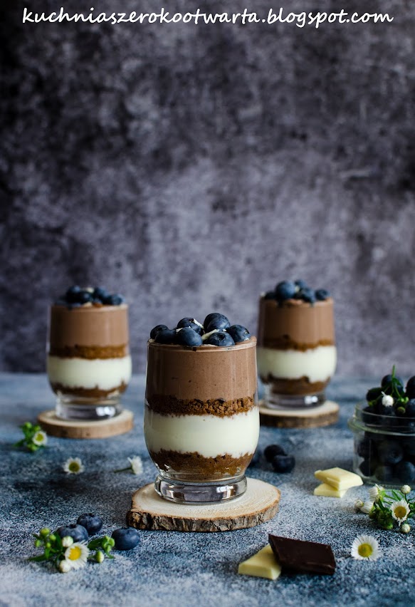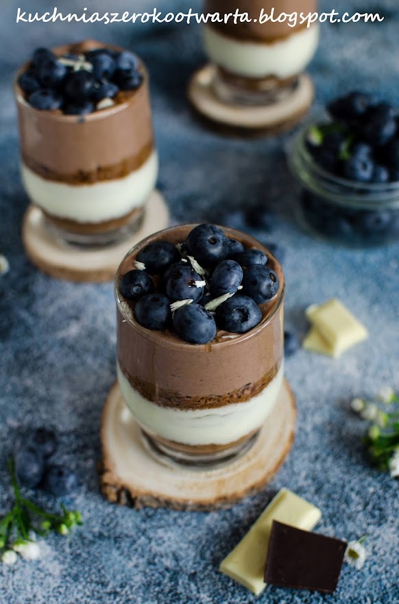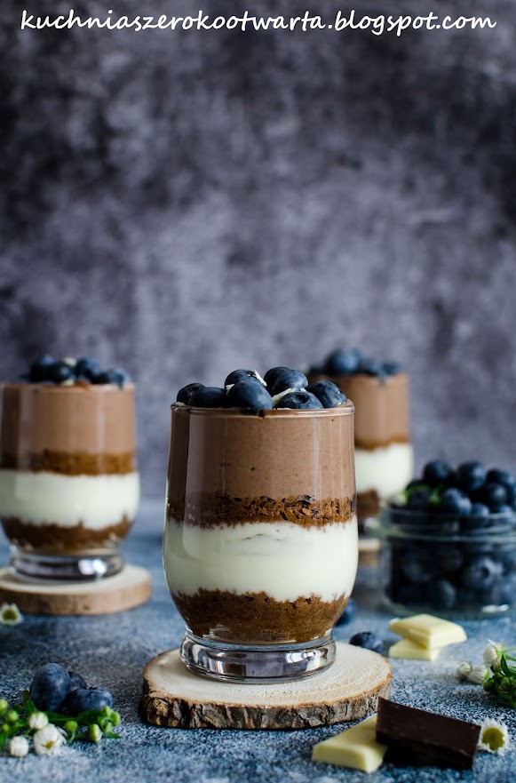 Uwielbiam takie proste i szybkie w przygotowaniu desery 😀 Powstają najczęściej w wyniku zupełnego eksperymentu z tego, co akurat mam w lodówce 😀 Jogurt i czekolada to chyba dwa podstawowe składniki, które zawsze staram się mieć w domu. Jeśli do tego dorzucicie sezonowe owoce – w tym przypadku pyszne borówki, macie deser jak z dobrej cukierni 😉 Prosto, szybko i pysznie 😉