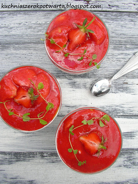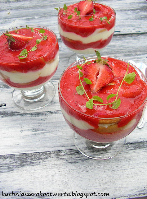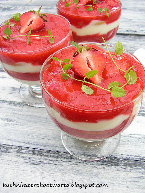 Wreszcie są nasze polskie truskawki. Jeszcze malutkie, niepozorne, ale coraz smaczniejsze. Sezon truskawkowy warto wykorzystać w pełni, zaczynając od pysznego i szybkiego deseru. Wystarczy kilka składników, aby wyczarować truskawkowe pucharki pełne smaku. Najlepiej smakują schłodzone, ale jeśli nie możecie oprzeć się pokusie zjedzenia ich od razu, możecie podać je zaraz po przygotowaniu. Polecam! 🙂