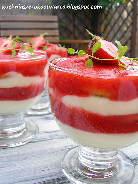 Budyń ugotować według przepisu na opakowaniu na 350 ml mleka z dodatkiem 2 1/2 łyżki cukru. Wystudzić. Zimny budyń zmiksować z jogurtem i ekstraktem z wanilii. Truskawki umyć, oczyścić i wysuszyć. Zmiksować z dwoma łyżkami cukru pudru. W pucharkach (lub szklankach) układać warstwami biszkopty, krem budyniowy i mus truskawkowy, aż do wyczerpania składników. Wierzch deseru udekorować truskawkami i listkami mięty. Schłodzić przed podaniem. Smacznego!