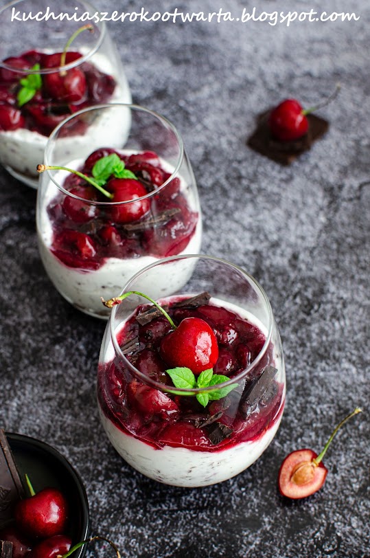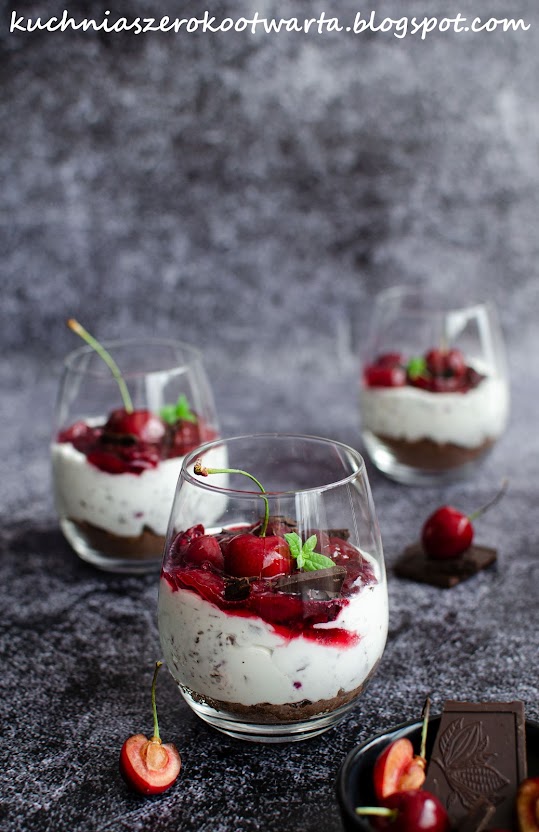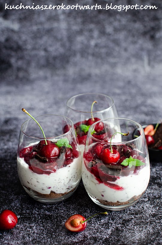 Czereśnie wydrylować i przełożyć do rondla, zalać wodą, dodać cukier i sok z cytryny. Gotować na wolnym ogniu, aż czereśnie puszczą sok, lekko zmiękną i odparuje połowa płynu. Dodać mąkę ziemniaczaną i energicznie wymieszać. Krótko podgotować i odstawić do przestudzenia. Śmietanę ubić na sztywno z cukrem pudrem. Dodać posiekaną czekoladę. Ciastka zblendować na piasek. Przesypać na dno szklanek, dodać krem i frużelinę. Udekorować świeżymi czereśniami, czekoladą i miętą. Schłodzić przed podaniem. Smacznego!