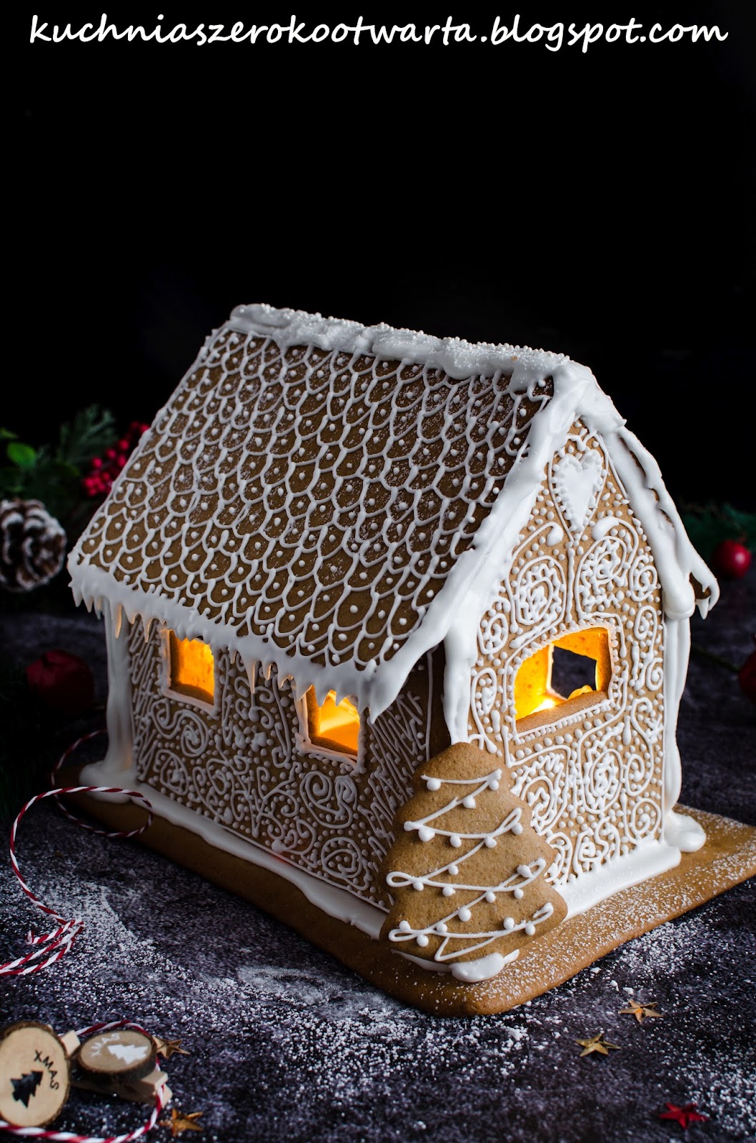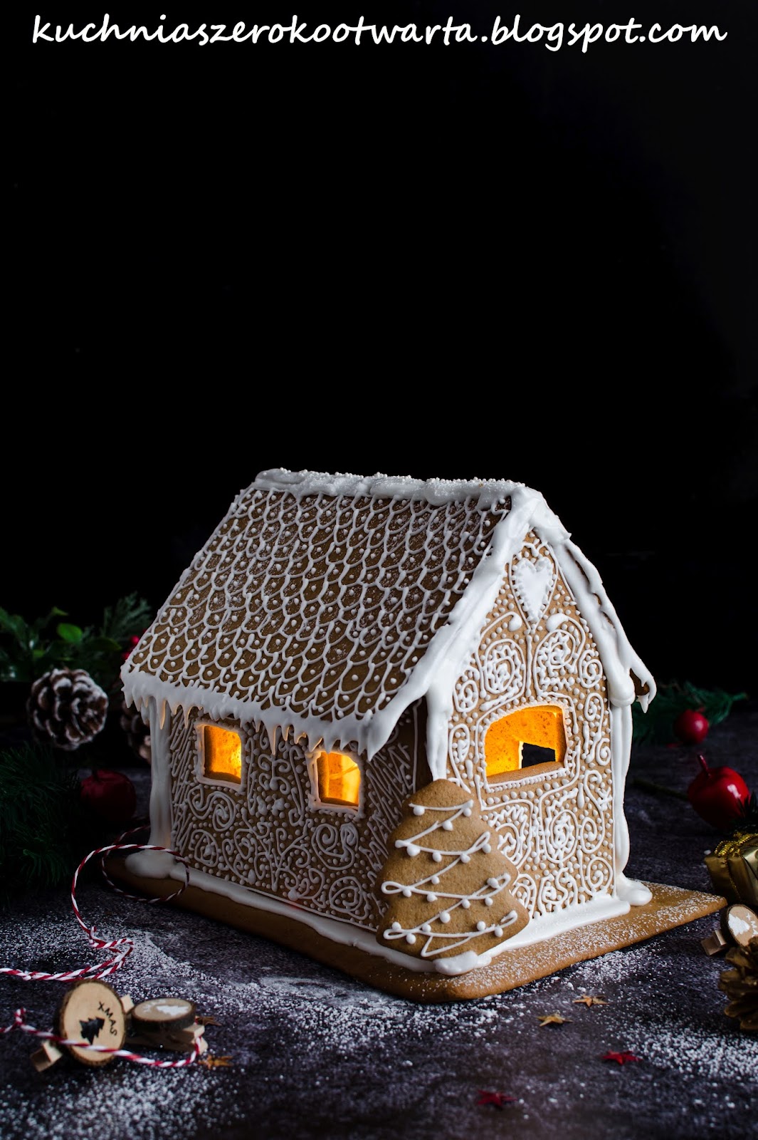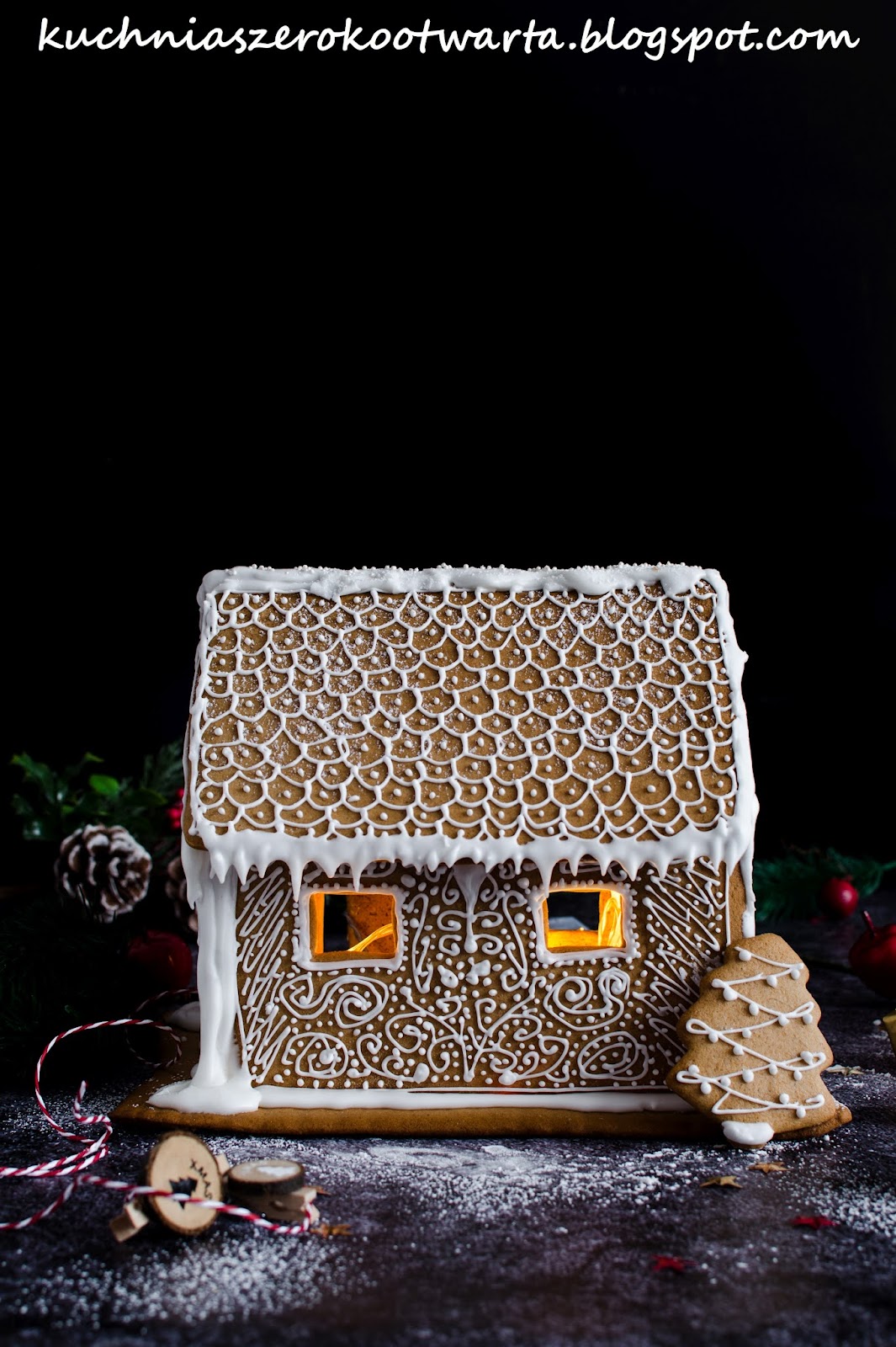 Mój pierwszy domek z piernika 🙂 Przygotowany na klasycznym cieście na pierniczki, z którego korzystam od lat (KLIK). Chociaż przygotowanie takiego domku wymaga czasu, cierpliwości i odrobiny sprawności to efekt jest tego wart. Do przygotowania domku użyłam gotowych foremek na domek z piernika. Jeśli nie macie takich, z powodzeniem możecie przygotować szablon ścian i dachu na kartce papieru czy tekturze i wykrawać nożem elementy z rozwałkowanego ciasta. Sporo gotowych szablonów znaleźć można także na Internecie 😉 Taki domek będzie nie tylko piękną, świecącą ozdobą świątecznego stołu, ale także może być jadalnym, świątecznym podarunkiem. Tuż po upieczeniu ciasto jest twarde, z czasem miękkie i nadaje się do konsumpcji 😉 Przepis jest z 500 g mąki, jest to odpowiednia ilość do zrobienia 1 dość dużego domku (mój miał wymiar 19 cm wysokość, 13 cm szerokość, 20 cm długość) oraz podstawy (19 cmx26 cm). Jeśli zostanie Wam ciasta, możecie upiec z niego świąteczne pierniczki 🙂