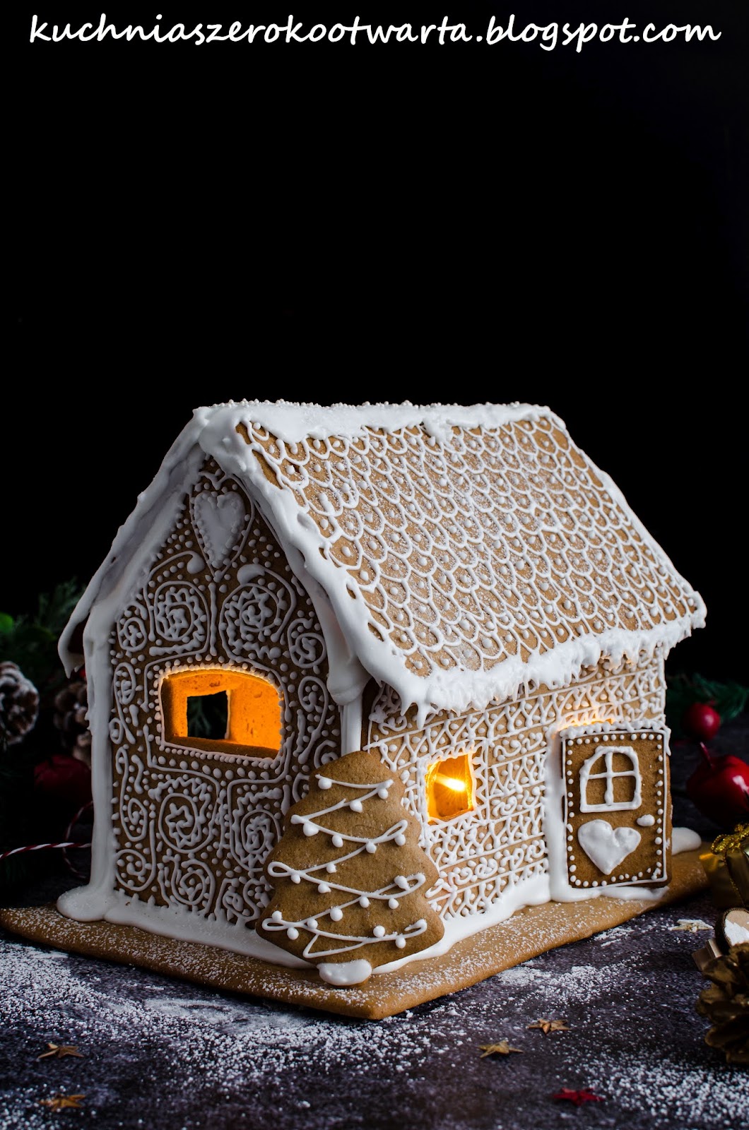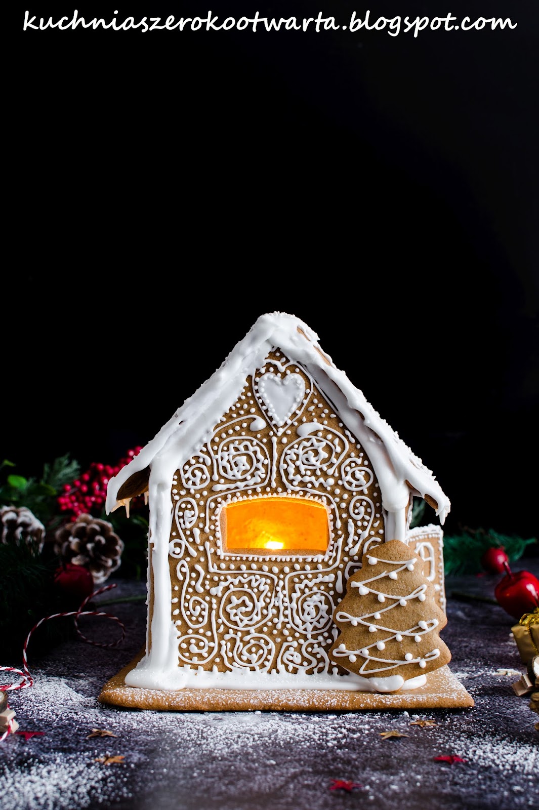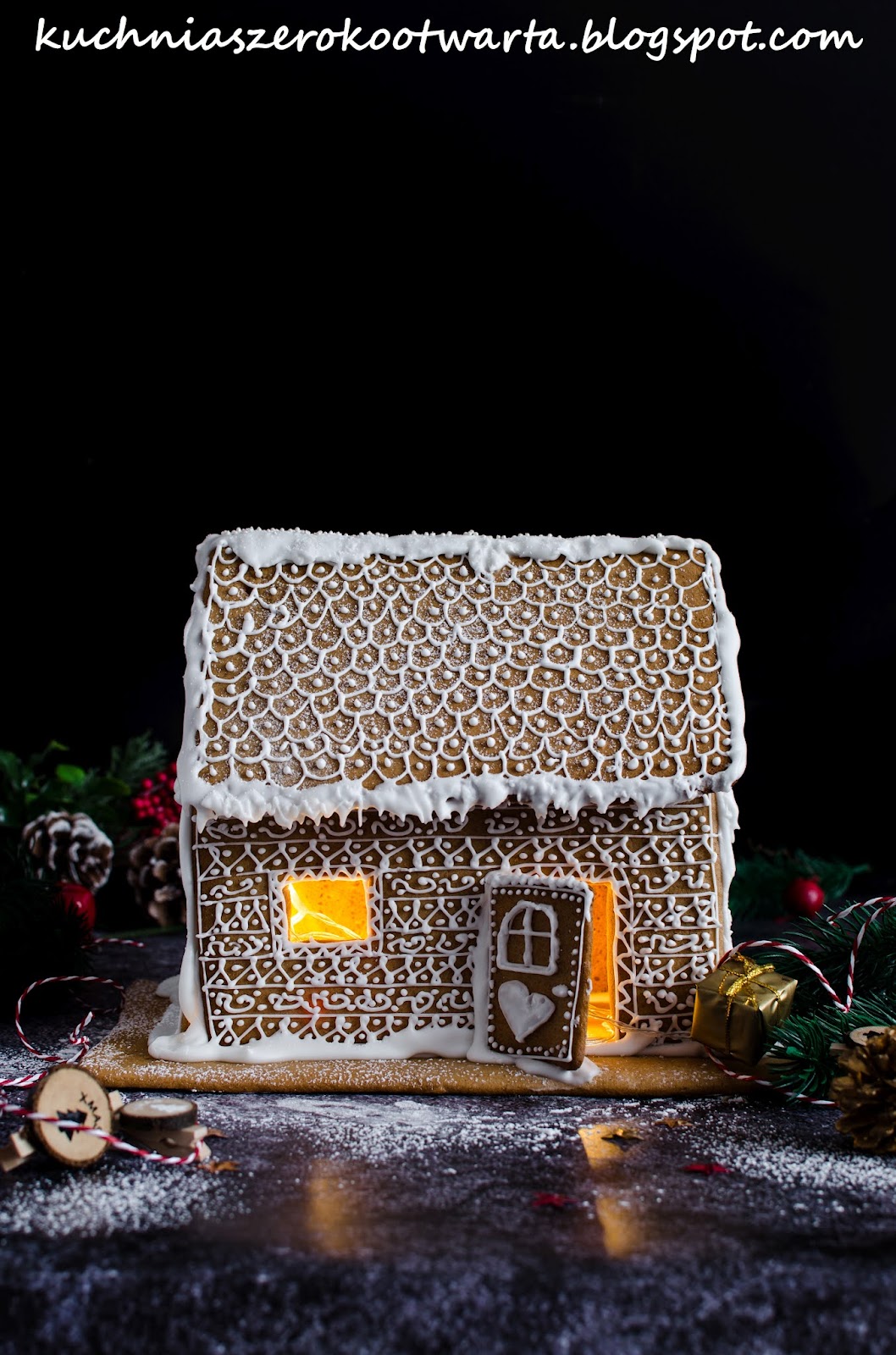 Mój pierwszy domek z piernika 🙂 Przygotowany na klasycznym cieście na pierniczki, z którego korzystam od lat (KLIK). Chociaż przygotowanie takiego domku wymaga czasu, cierpliwości i odrobiny sprawności to efekt jest tego wart. Do przygotowania domku użyłam gotowych foremek na domek z piernika. Jeśli nie macie takich, z powodzeniem możecie przygotować szablon ścian i dachu na kartce papieru czy tekturze i wykrawać nożem elementy z rozwałkowanego ciasta. Sporo gotowych szablonów znaleźć można także na Internecie 😉 Taki domek będzie nie tylko piękną, świecącą ozdobą świątecznego stołu, ale także może być jadalnym, świątecznym podarunkiem. Tuż po upieczeniu ciasto jest twarde, z czasem miękkie i nadaje się do konsumpcji 😉 Przepis jest z 500 g mąki, jest to odpowiednia ilość do zrobienia 1 dość dużego domku (mój miał wymiar 19 cm wysokość, 13 cm szerokość, 20 cm długość) oraz podstawy (19 cmx26 cm). Jeśli zostanie Wam ciasta, możecie upiec z niego świąteczne pierniczki 🙂