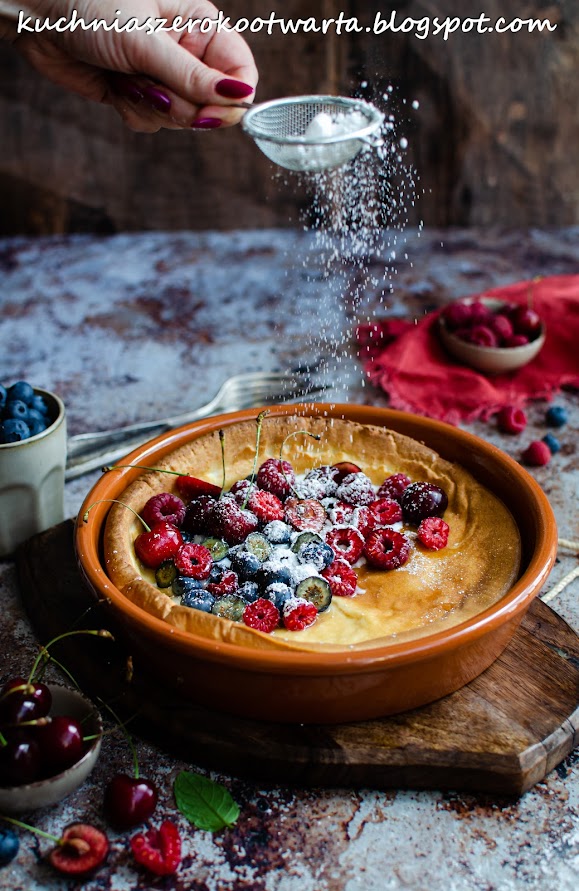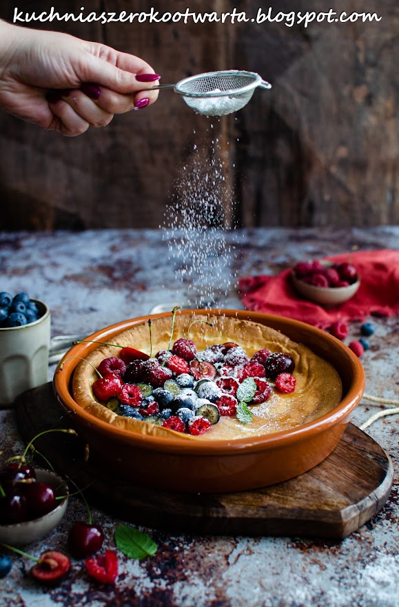 Dutch baby czyli pieczony naleśnik to świetny pomysł na letnie śniadanie na słodko 😉 Podany z jogurtem naturalnym, świeżymi letnimi owocami, miodem lub/i cukrem pudrem tworzy prawdziwą ucztę dla podniebienia 😀 Najważniejsze w tym przepisie jest wcześniejsze moce rozgrzanie naczynia (czy też patelni) w którym będziecie piec naleśnik oraz bardzo krótkie zmiksowanie składników, aby nadmiernie nie napowietrzać masy 😉 Owoce możecie dowolnie modyfikować, jogurt zastąpić serkiem waniliowym lub smakowym bądź naturalnym skyrem 🙂 W każdym wydaniu będzie smakować bosko 🙂