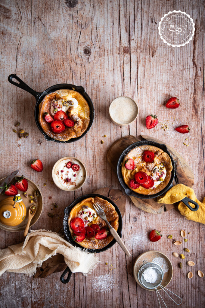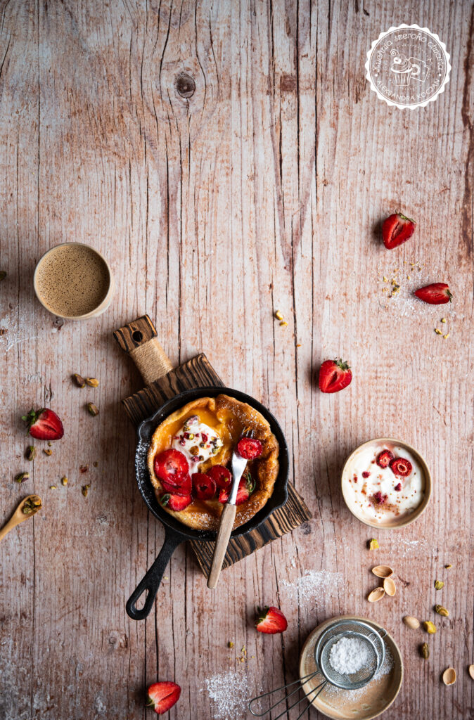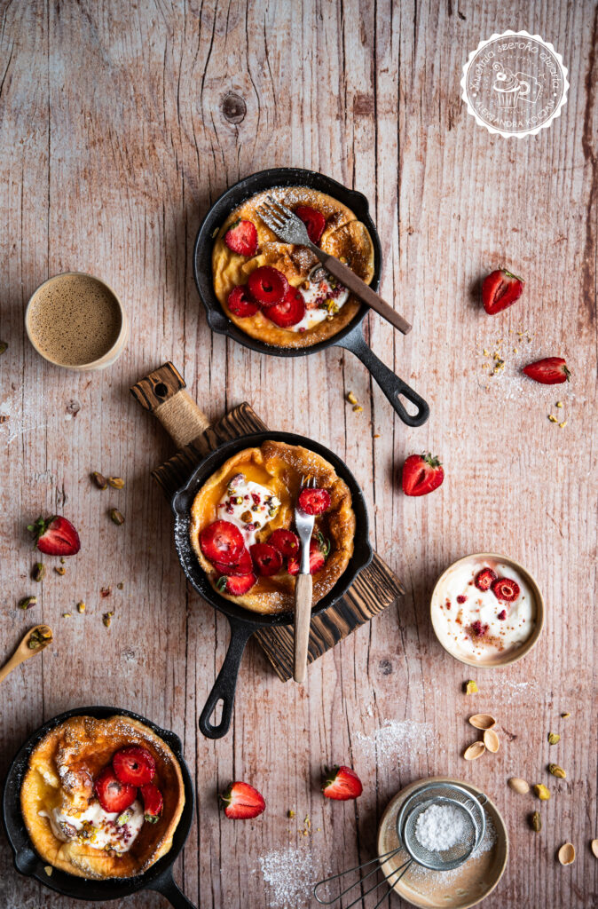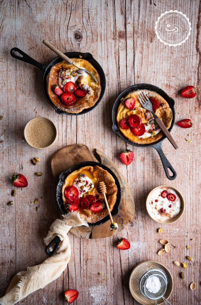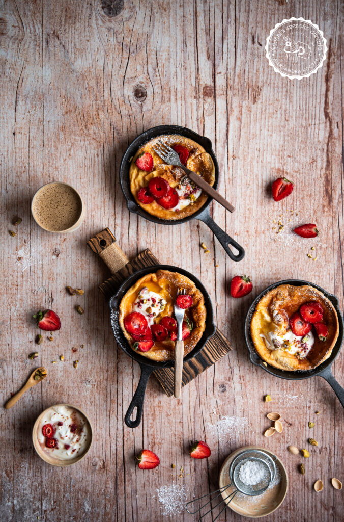 Idealne, letnie śniadanie! Puszysty, pachnący wanilią i masłem pieczony naleśnik to propozycja nie tylko na pożywne śniadanie na słodko, ale też na deser. Dutch baby podany ze świeżymi truskawkami, jogurtem, miodem i chrupiącymi pistacjami to prawdziwa uczta dla podniebienia. Jeśli dodatkowo chcesz podkręcić jego smak, możesz polać go kremem pistacjowym.