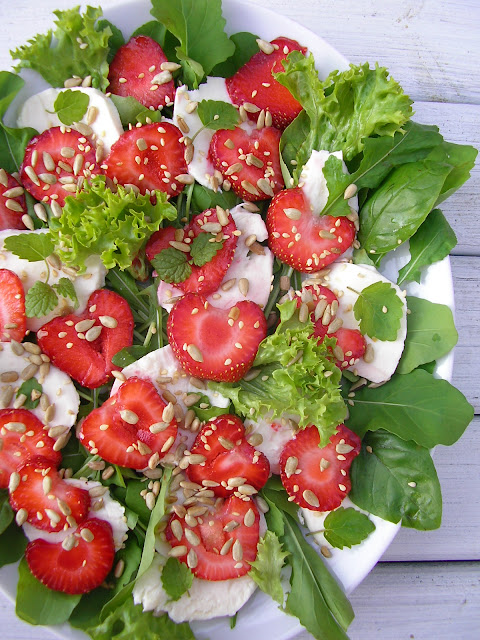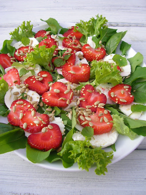 Bardzo pyszna sałatka z truskawkami, mozzarellą i rukolą posypana prażonymi ziarnami. Bardzo lubię takie niecodzienne połączenia, które tylko z pozoru mogą wydawać się dziwne. W tej sałatce smaki przenikają się subtelnie i stopniowo, tworząc bardzo ciekawą kompozycję smakową.
