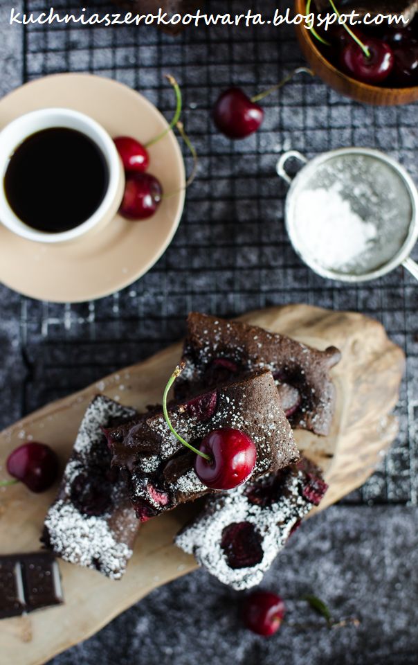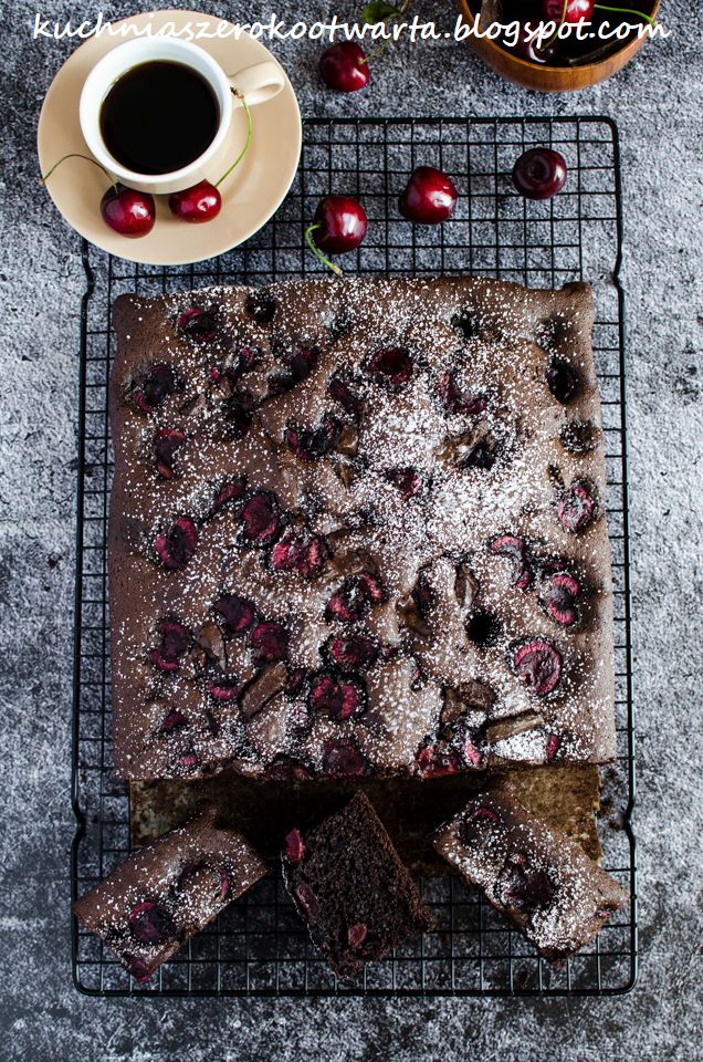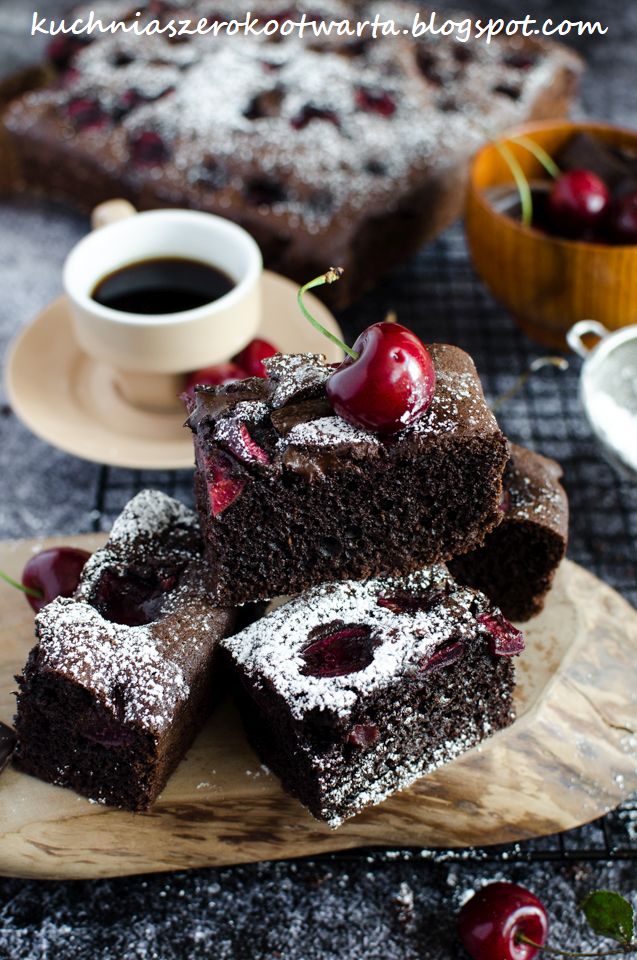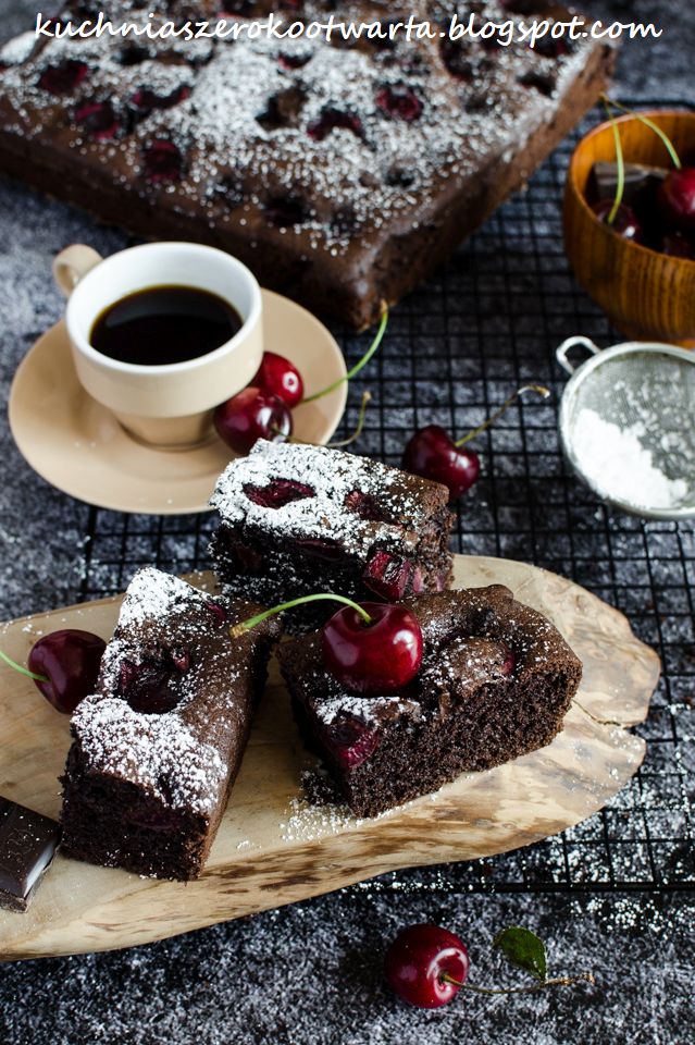 Coś dla wielbicieli mocno czekoladowych smaków 🙂 To ciacho nie jest za słodkie, więc jeśli preferujecie słodsze smaki możecie dodać więcej cukru 😉 Przygotowuje się je naprawdę szybką, najwięcej czasu zajmuje drylowanie czereśni, reszta nie zajmie Wam więcej niż 10 minut. Dzięki dodatkowi oleju ciacho jest wilgotne i dłużej zachowuje świeżość. Czekolada i czereśnie to mariaż doskonały 🙂