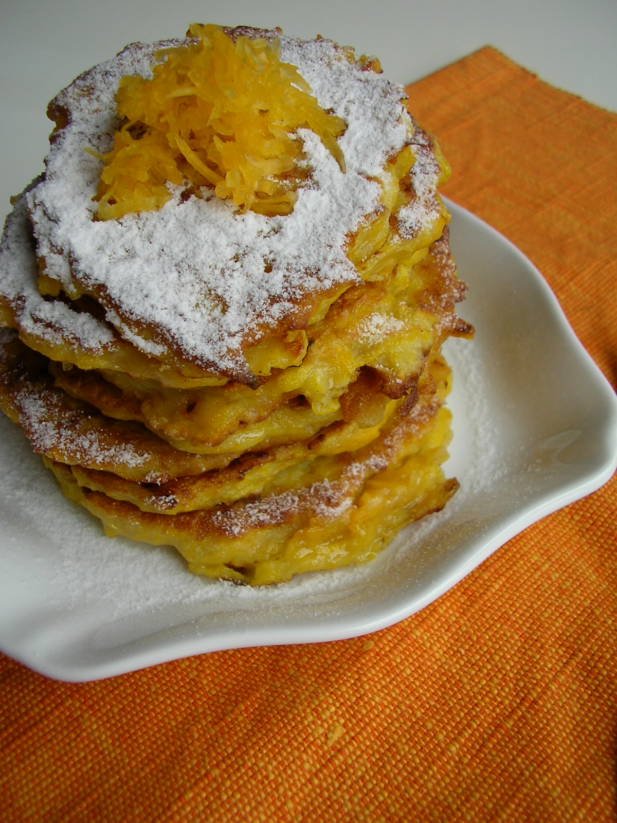 Dynię zetrzeć na grubych oczkach. Dodać jajka, mąkę, cukier i cynamon. Wymieszać i odstawić na kilka minut do napęcznienia mąki i zagęszczenia się masy. Na patelni rozgrzać niewielką ilość oleju. Smażyć małe placuszki z obu stron na złoty kolor. Podawać ciepłe posypane cukrem pudrem.