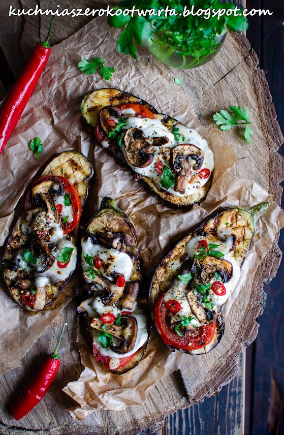 Ten bakłażan ma w sobie coś wyjątkowego 😉 Mięsiste, aromatyczne wnętrze i cudowne dodatki w postaci grillowanych pomidorów, pieczarek i ciągnącego się sera. Świetny na przystawkę, dodatek do mięs z grilla, na kolację lub samodzielną przekąskę. Jak wolicie, jak lubicie 😉 Mocno polecam 😀