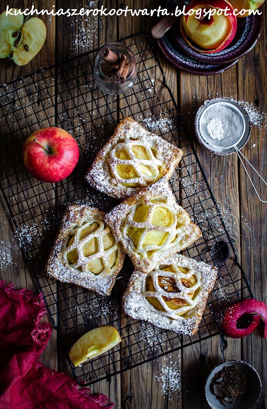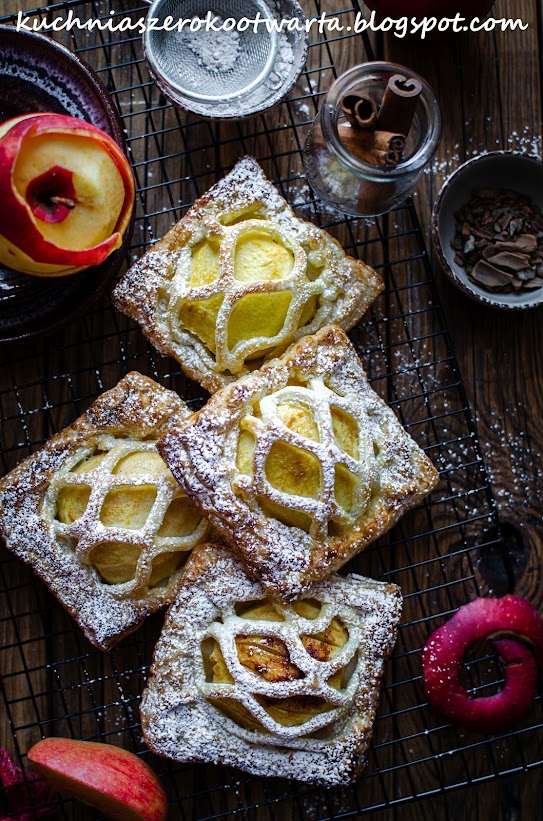 Jabłka obrać i przekroić na połówki. Usunąć gniazda nasienne. Posypać cukrem. 2/3 ciasta pokroić na 6 kwadratów na wielkość jabłek, pozostawiając ok. 1 cm brzeg. Na każdym kwadracie ułożyć połówkę jabłka „ogryzkiem” do dołu. Pozostałą część ciasta przeciąć wałkiem do wycinania kratki na cieście lub pociąć nożem na cienkie paski. Nacięte ciasto rozciągnąć i podzielić na 6 kwadratów. Ułożyć na cieście z jabłkami i zlepić brzegi dociskając np. widelcem. Ciastka przełożyć na blaszkę wyłożoną papierem do pieczenia. Posmarować za pomocą pędzelka rozkłóconym jajkiem i wstawić do piekarnika nagrzanego do 210 stopni (grzałka góra-dół). Piec 15-20 minut, do czasu, aż ciasto ładnie wyroście i się zarumieni. Cukier puder wymieszać z cynamonem. Ciepłe ciasta posypać cukrem pudrem. Smacznego!