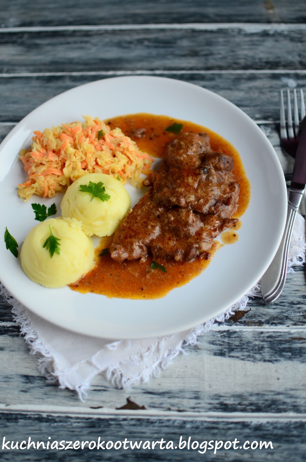 Karczek pokroić na centymetrowe plastry, lekko rozbić. Przełożyć do miski. Dodać wino, miód, posiekany czosnek, cebulę pokrojoną w ósemki i żurawinę. Mięso natrzeć marynatą i wstawić do lodówki na przynajmniej 12 godzin. Co jakiś czas mięso obracać. Zamarynowane mięso osuszyć na ręczniku papierowym, posolić i oprószyć pierzem, obtoczyć w mące i smażyć partiami na dobrze rozgrzanym oleju z obu stron do zarumienienia. Przełożyć do garnka. Zalać połową marynaty wraz z żurawiną. Dolać bulion dodać paprykę i koncentrat. Dusić na wolnym ogniu do miękkości mięsa i zredukowania sosu. W razie potrzeby dolać więcej bulionu. Pod koniec duszenia sos doprawić solą, pieprzem i dodać łyżkę masła. Podawać z ziemniakami i ulubioną surówką. Smacznego!