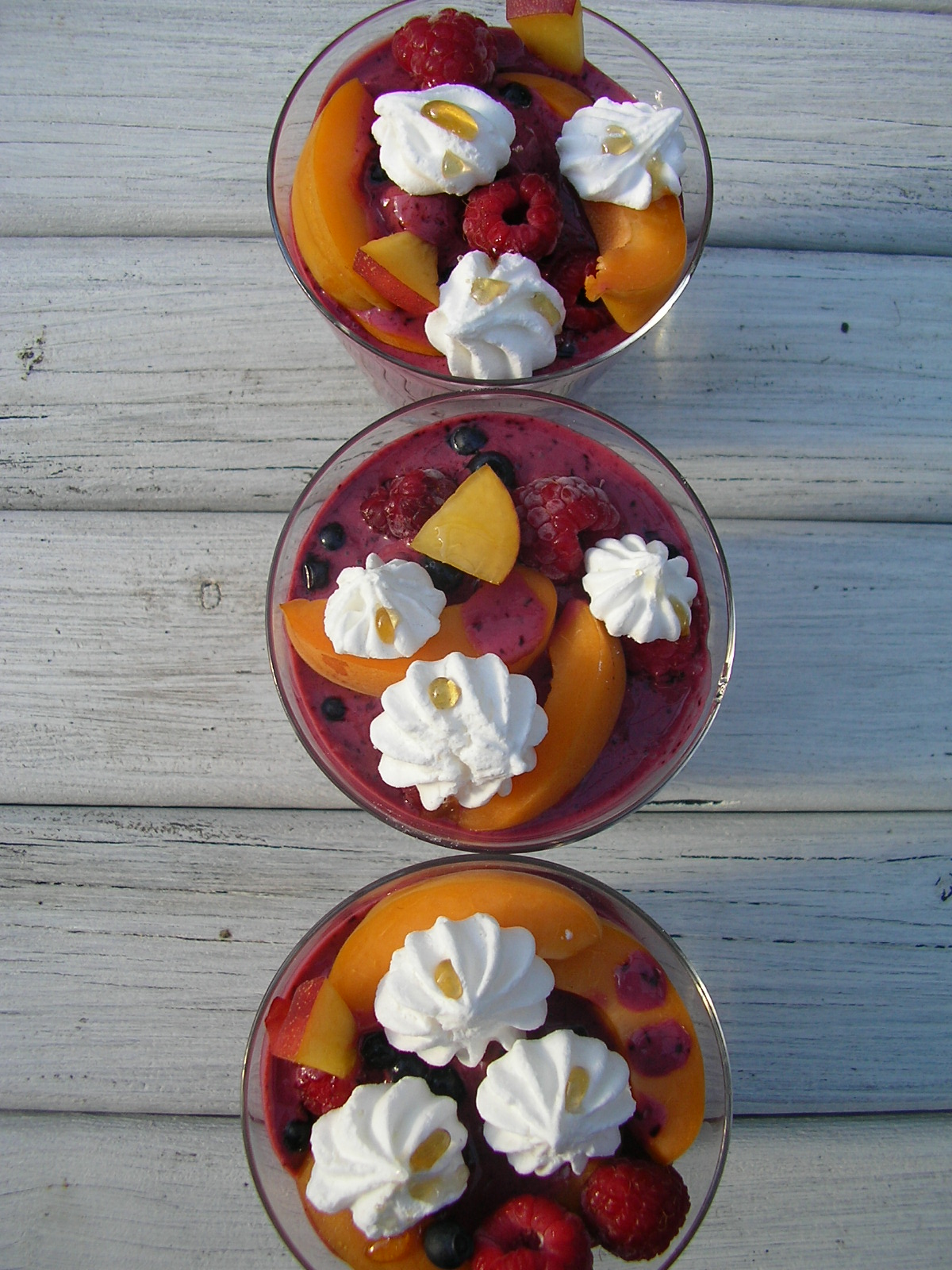 Jagody zmiksować z jogurtem i cukrem pudrem. Na dno szklanek ułożyć po kilka bez. Na bezy ułożyć pokrojone w cząstki morele i nektarynki, posypać malinami. Owoce polać sosem jagodowym, udekorować bezami i polać syropem. Podawać od razu. Smacznego!