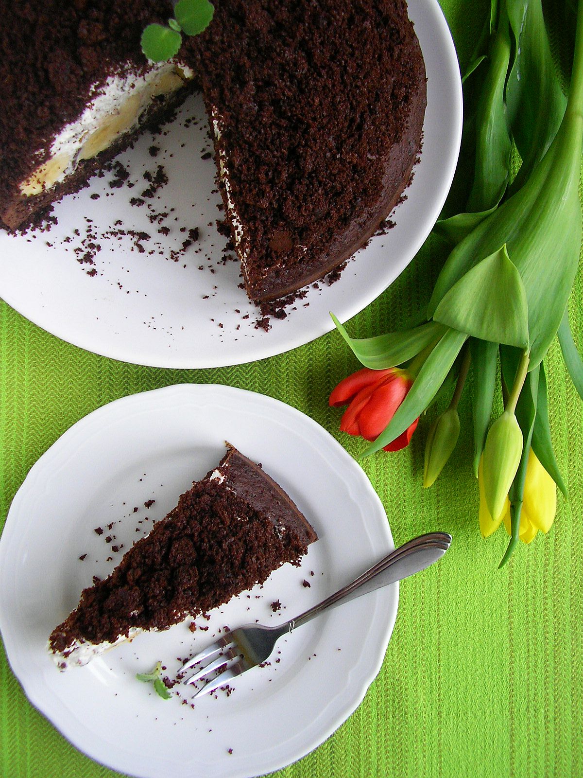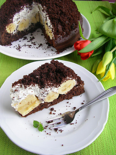 Podobno to ciasto kojarzy się z gotowcem z torebki. Nie wiem jak smakuje popularny kopiec z torebki, ale wiem jak smakuje prawdziwy domowy kopiec kreta :). Ten w mojej wersji jest mocno czekoladowy i nie za słodki. Dodatek śmietany nadaje ciastu lekkości, która cudownie równoważy cięższe ciasto czekoladowe. Całość dopełniają banany. Kopiec kreta to ciacho dla miłośników czekolady…