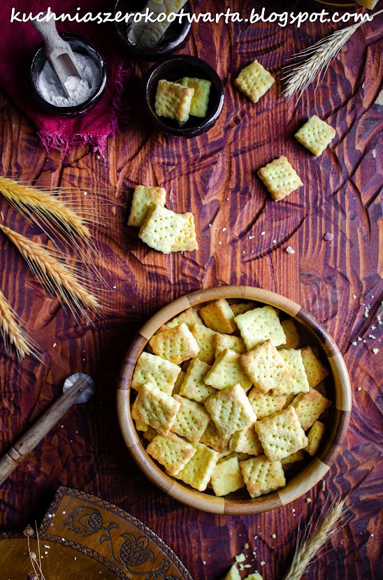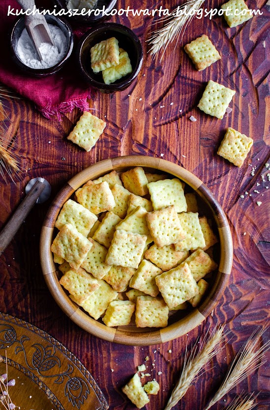 Śmietanę można zastąpić 1-2 łyżkami lodowatej wody. Krakersy można pokroić w dowolne kształty np. romby lub wycinać za pomocą małych foremek do ciastek.
