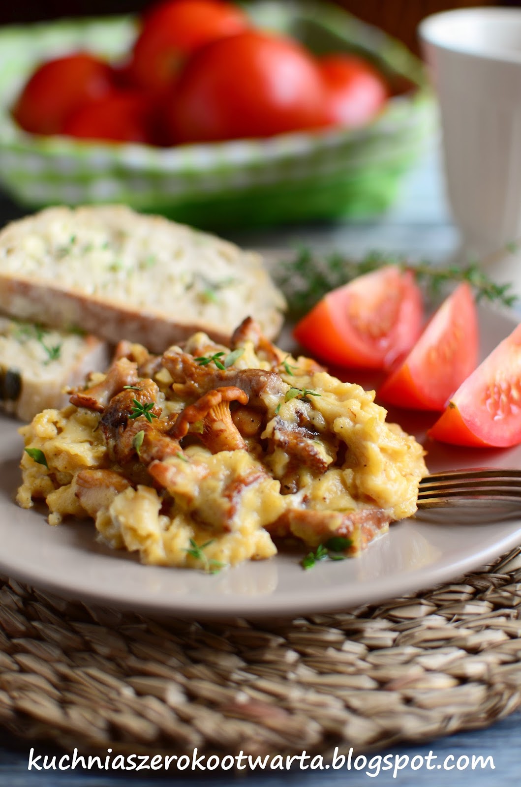 Jedno z moich pierwszych kulinarnych wspomnień z dzieciństwa to właśnie jajecznica. Prawdziwa, na jajach tyle co zebranych z kurnika. Na prawdziwym maśle. Solona. Dziadek przygotowywał ją w czarodziejskim rondelku – starym, nadgryzionym przez czas. Ten smak pozostanie ze mną już na zawsze. Częścią rodzinnej tradycji była też niedzielna jajecznica serwowana przez tatę. Długo czekało się na jej podanie – przygotowywana była na wolnym ogniu – mieszana powoli, odpowiednio przyprawiana…dopieszczana. W pamięci zapadła mi również niesamowicie kremowa jajecznica, przygotowana przez moją babcię – na parze. Tak na parze! Babcia stawiała na dużym garnku z gotującą się wodą mały talerzyk, na który wbijała jajko – długo mieszała – na koniec dodawała łyżeczkę masła. Do dziś uwielbiam jajka w każdej postaci – mogłabym jeść je na okrągło. Wczoraj zostałam obdarowana sporą ilością świeżych grzybów. Wśród nich były też złociste kurki. Jajecznica z kurkami to jak dla mnie połączenie idealne. Kremowa i delikatna – prawdziwa uczta dla podniebienia. Wbrew pozorom nawet tak prostą rzecz jaką jest pospolita jajecznica można zepsuć. Dziś zdradzę Wam przepis na (według mnie) idealną, rozpływającą się w ustach jajecznicę. A jak Wy przygotowujecie swoją ulubioną jajecznicę?