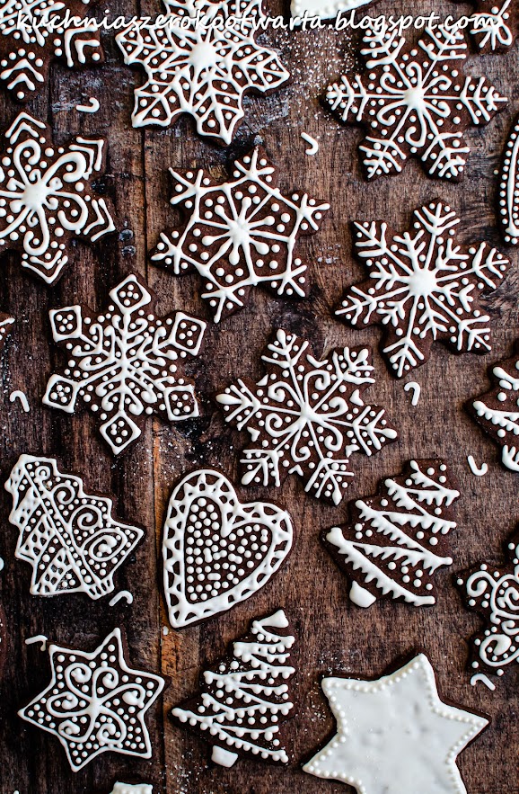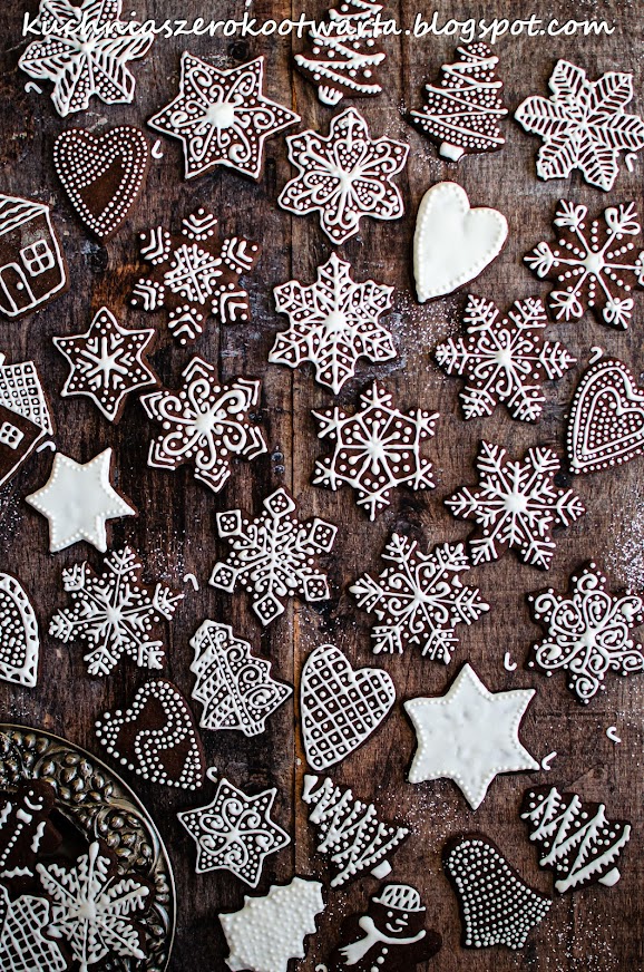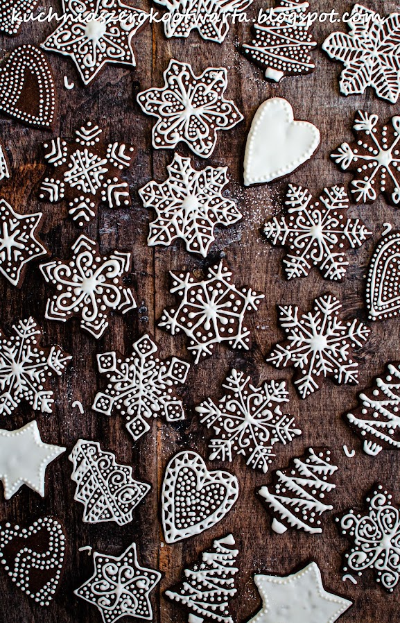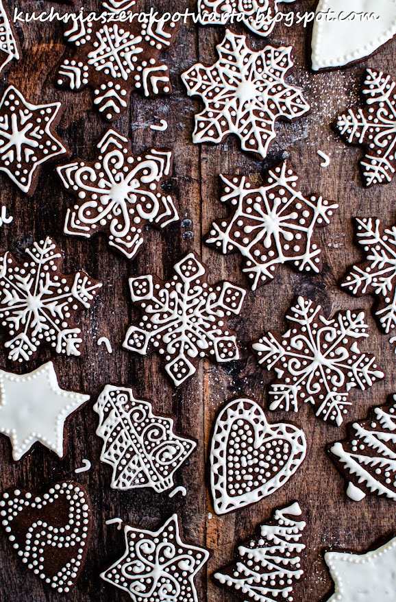 Lukier: Jajko sparzyć wrzątkiem. Składniki na lukier krótko (aby nie napowietrzyć lukru) zmiksować. Lukier przelać do rękawa cukierniczego z tylką do zdobienia lukrem (Wilton nr 1) lub przelać do mocnego woreczka np. strunowego i odciąć rożek o średnicy 1 mm. Ciastka dowolnie udekorować lukrem. Smacznego!