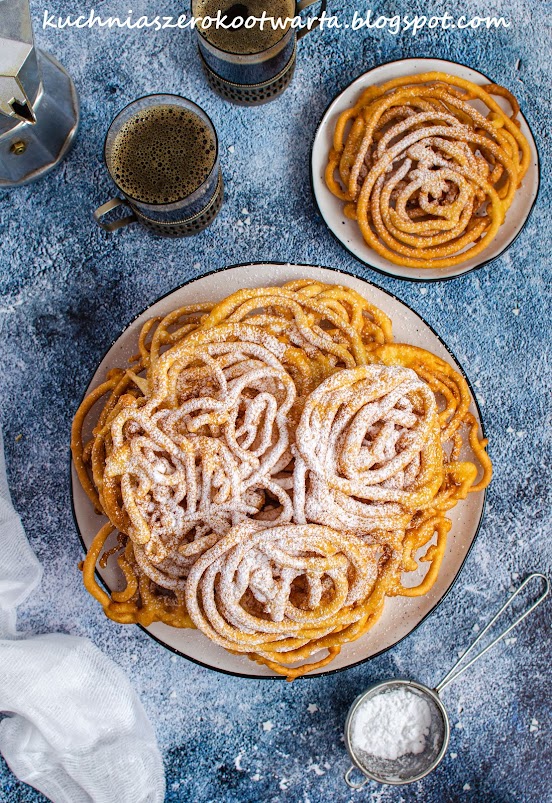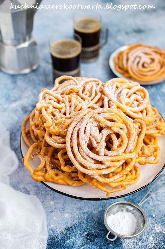 Białka oddzielić do żółtek. Do białek dodać szczyptę soli i ubić na sztywną pianę. Żółtka przełożyć do miski dodać cukier waniliowy i zmiksować do podwojenia objętości. Dodać wódkę, mleko oraz mąkę, zmiksować do połączenia się składników. Dodawać do łyżce ubitych białek i delikatnie wymieszać. Olej rozgrać do temperatury ok. 175 stopni. Ciasto przełożyć do rękawa cukierniczego z okrągłą tylką lub do woreczka strunowego (odciąć mały otwór w rogu worka). Ciasto wylewać okrężnymi ruchami na rozgrzany olej, smażyć z obydwu stron na złoty kolor. Po usmażeniu wykładać na talerz wyłożony ręcznikiem papierowym. Przed podaniem oprószyć cukrem pudrem. Smacznego!