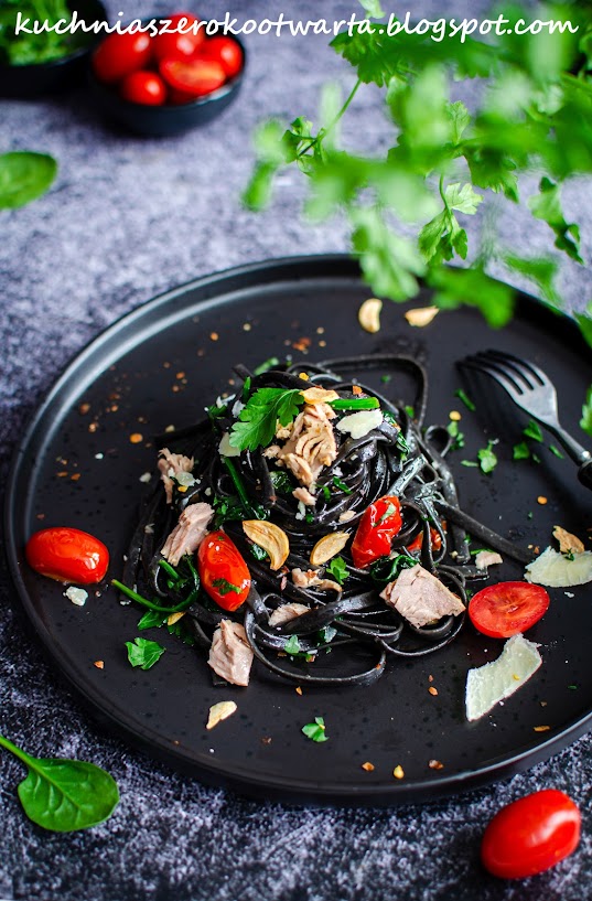 Obłędny makaron z tuńczykiem w oliwie, szpinakiem i pomidorkami. Pikantny, wyrazisty w smaku, idealnie doprawiony. Jeden z lepszych makaronów jakie jadłam. Jeśli jesteście miłośnikami ryb, ten przepis z pewnością przypadnie Wam do gustu 🙂