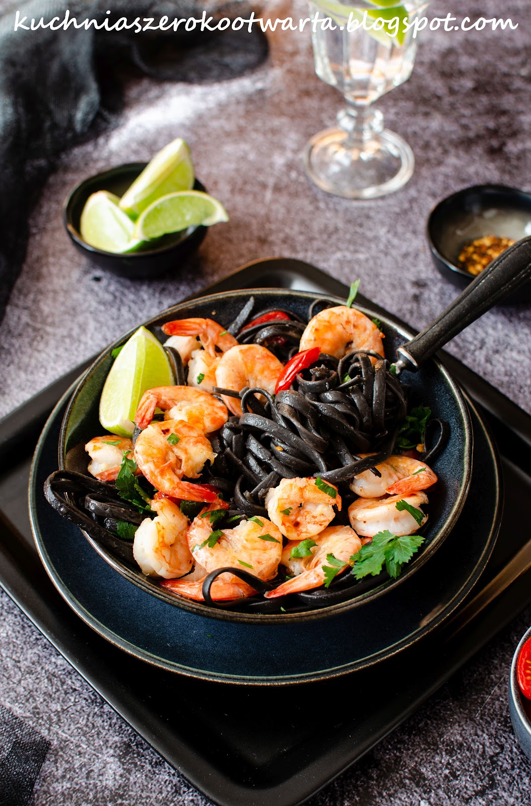 Makaron ugotować al dente w osolonej wodzie. Odcedzić i dodać do krewetek. Wymieszać i posypać natką pietruszki. Podawać od razu po przygotowaniu z cząstkami limonki. Smacznego!