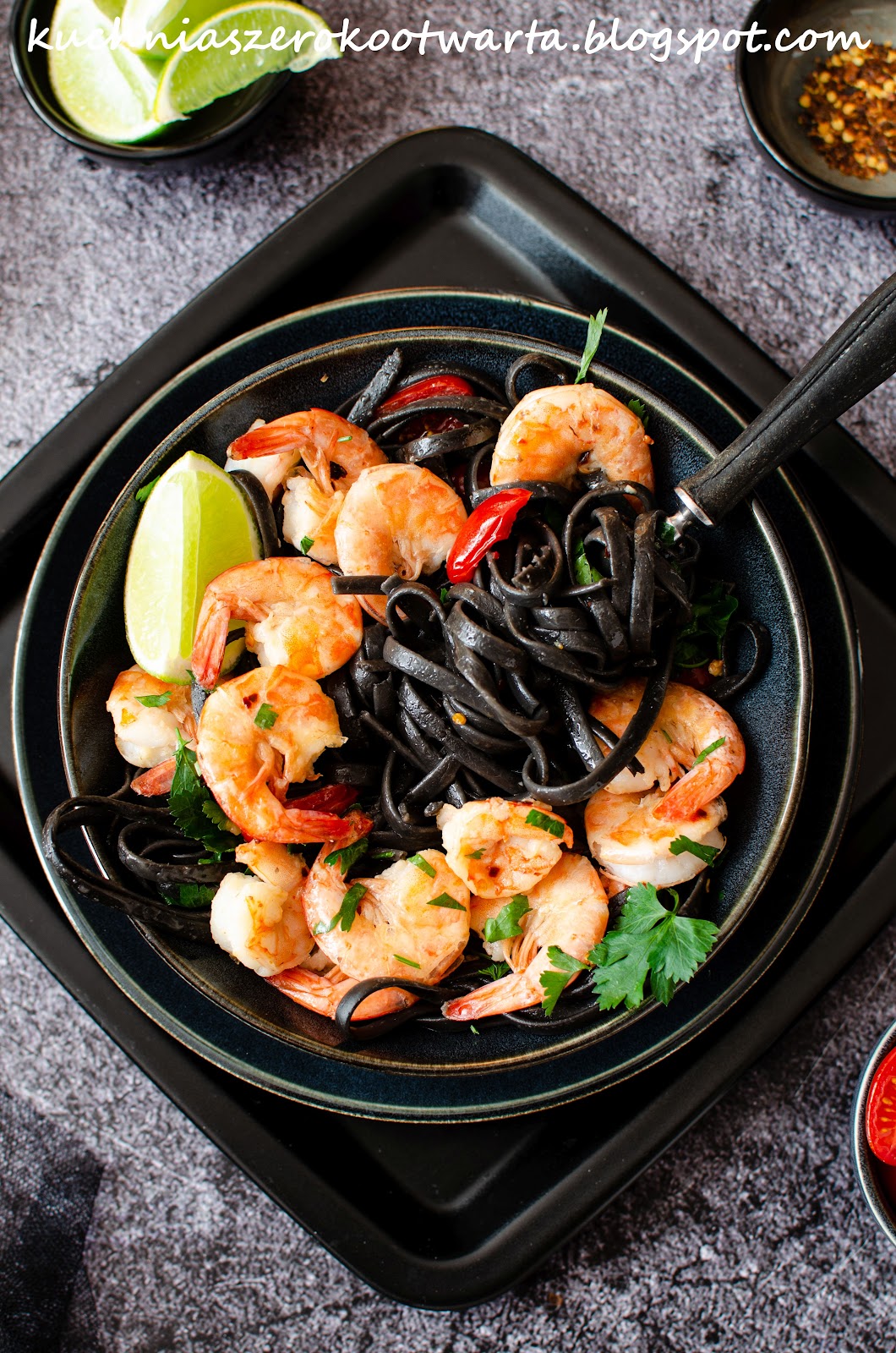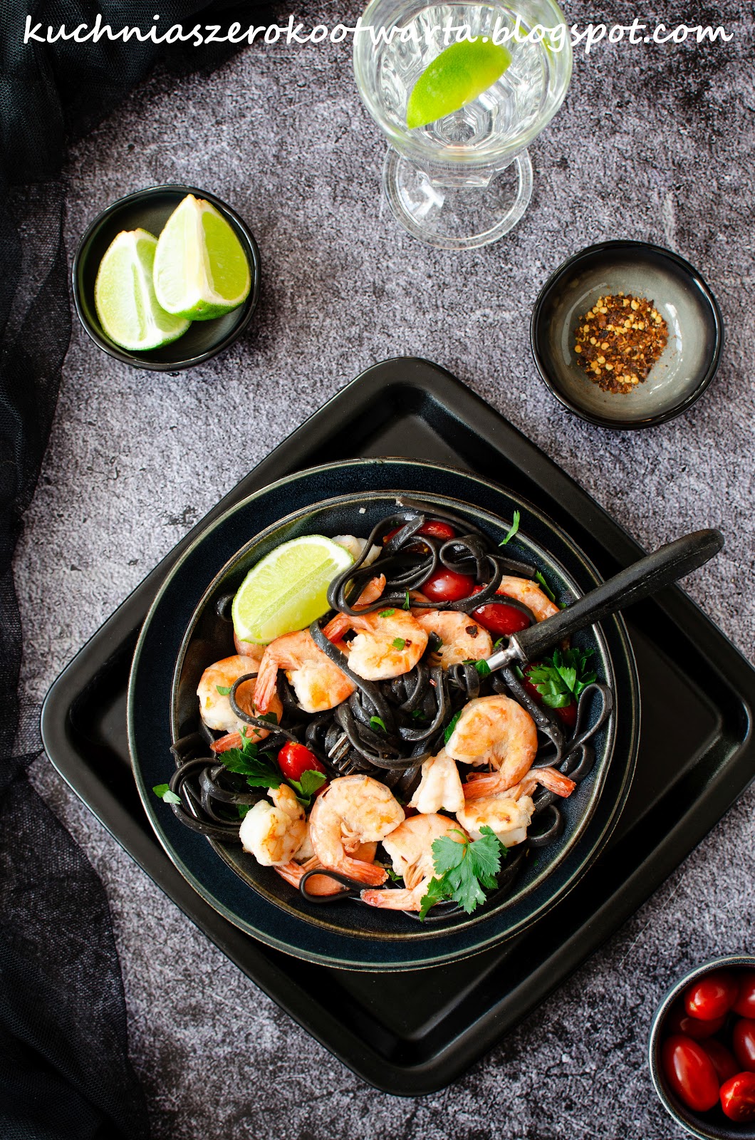 Krewetki (jeśli są mrożone) rozmrozić, oczyścić i obrać. Osuszyć na ręczniku papierowym. Na patelni rozpuścić masło z oliwą. Podać przeciśnięty czosnek oraz krewetki. Smażyć na średnim ogniu po ok. 1 minucie z każdej strony. Dodać płatki chili, pokrojone pomidorki koktajlowe i podsmażyć ok. 1 minutę. Doprawić do smaku solą i skropić sokiem z limonki.