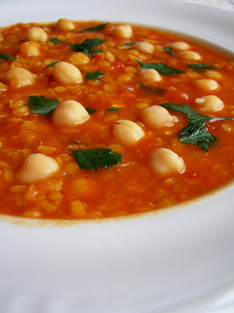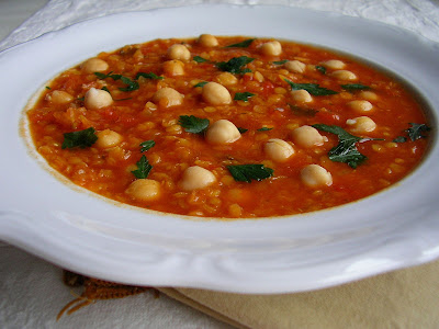 Smak tej zupy zaskoczył mnie całkowicie. Nie sądziłam, że połączenie pomidorów, soczewicy i ciecierzycy z kilkoma aromatycznymi przyprawami może być takie wyśmienite. Oryginalna zupa marokańska zwana harira doczekała się wielu wariantów. Jedni gotują ją na mięsie (baranina, jagnięcina), inny używają namoczonej i ugotowanej wcześniej ciecierzycy, jeszcze inny sypią sporą ilość świeżej kolendry.Wśród przypraw powinien znaleźć się też kumin (kmin rzymski), którego niestety nie miałam pod ręką.