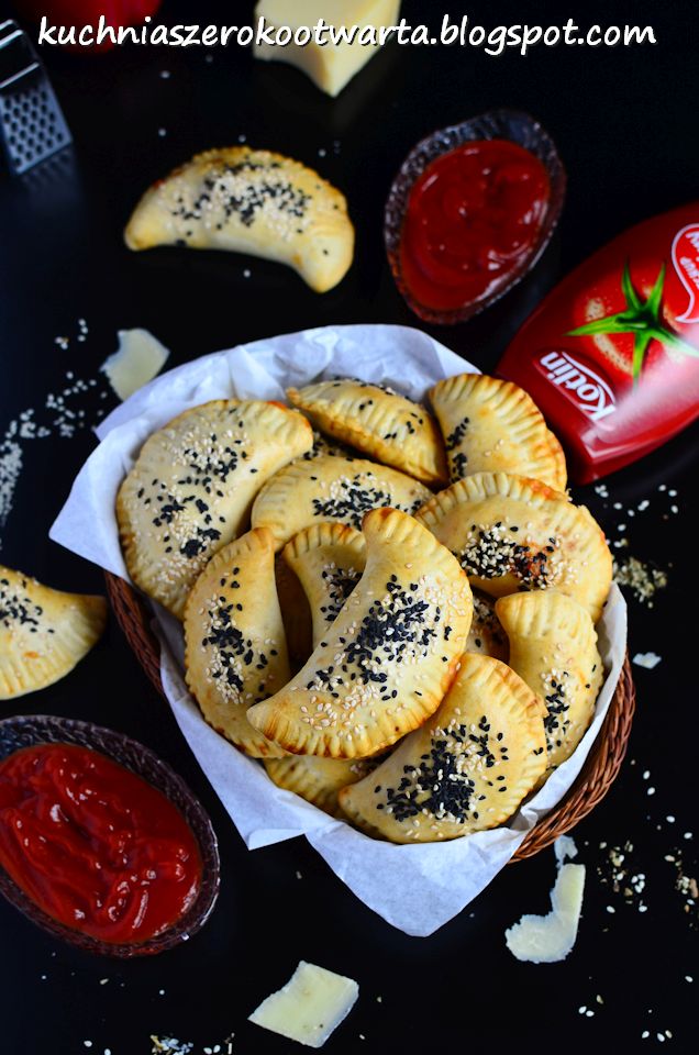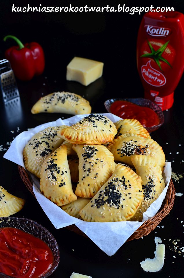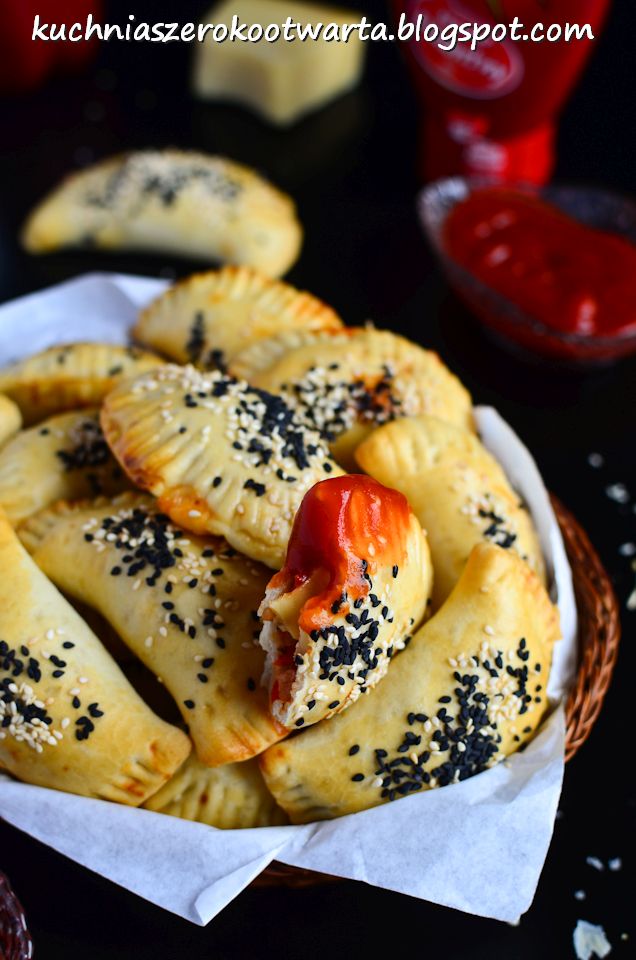 Podrośnięte ciasto rozwałkować na grubość ok. 0,5 cm. Za pomocą większej szklanki (lub pucharka do lodów) wykrawać koła. Środek każdego okręgu posmarować sosem, dodać cebulę, paprykę, szynkę oraz ser. Skleić brzegi ciasta i uformować pieroga. Boki dokładnie skleić za pomocą widelca. Pierożki układać na blaszce wyłożonej papierem do pieczenia, posmarować rozkłóconym jajkiem i posypać sezamem. Wstawić do nagrzanego do 180 stopni piekarnika i piec ok. 15-20 minut, do lekkiego zarumienienia. Podawać na ciepło lub na zimno z ketchupem. Smacznego!