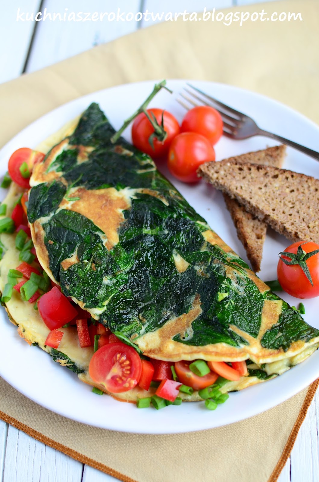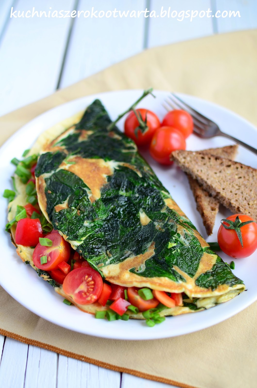 Uwielbiam śniadania z jajkami w roli głównej. Omlet to szybki, tani i bardzo smaczny sposób na dobry początek dnia. Omlet ze szpinakiem nie tylko wygląda bajecznie, ale także świetnie smakuje. Pamiętajcie, że warto doprawić go solidnie pieprzem i granulowanym czosnkiem. Wnętrze możecie wypełnić ulubionymi dodatkami. U mnie tym razem lekko i warzywnie – pomidorki w asyście papryki i szczypiorku. Pysznie!