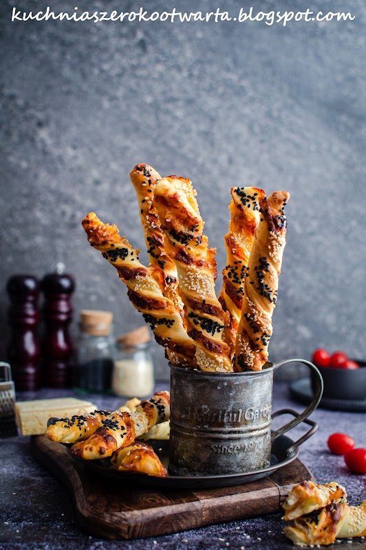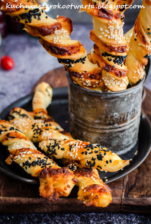 Mąkę wymieszać z drożdżami, cukrem i solą. Dodać wodę, rozkłócone jajko i stopione masło. Zagnieść gładkie, elastyczne ciasto. Ciasto przełożyć do miski i przykryć ściereczką. Odstawić w ciepłe miejsce do podrośnięcia na 1 godzinę. Wyrośnięte ciasto ponownie krótko zagnieść i rozwałkować na prostokąt o grubości około 0,5 cm. Posmarować ketchupem, posypać startą mozzarellą, grana padano i oregano. Prostokąt złożyć na pół. Wycinać paski ciasta o szerokości ok. 2 cm i skręcać oba końce jednocześnie wokół własnej osi. Przełożyć na blaszkę wyłożoną papierem do pieczenia, przykryć ściereczką i odstawić do podrośnięcia na ok. 15 minut. Paluchy posmarować rozkłóconym jajkiem i posypać sezamem. Piec ok. 15-20 minut w piekarniku nagrzanym do 190 stopni (grzałka góra-dół). Wystudzić na kratce. Smacznego!