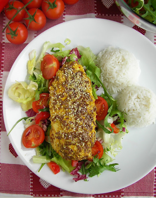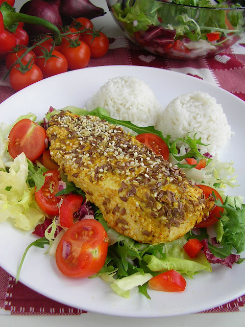 Piersi przełożyć do naczynia, posypać sezamem i siemieniem. Wstawić do nagrzanego do 170 stopni piekarnika na około 20-25 minut. Piersi podawać z sałatką i ryżem. Smacznego!