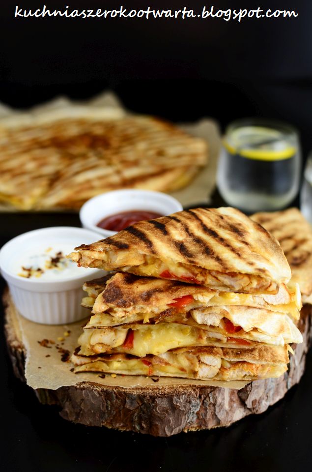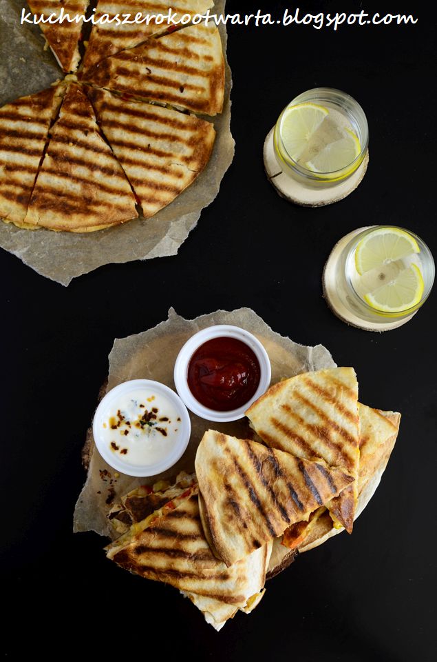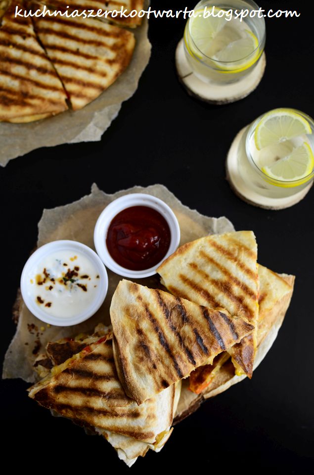 Danie rodem z Meksyku. Dwa placki tortilli nadziane dowolnymi składnikami i serem, który wiąże całość. W wersji oryginalnej przygotowywana najczęściej z chorizo i papryką, w wersji na ostro. Dlatego też, aby złagodzić ostry smak, danie to podaje się najczęściej z sosem na bazie śmietany, kolendry i soku z limonki, guacamole lub z pomidorową salsą. U mnie wersja nieco bardziej spolszczona, ale równie smaczna 🙂 Tortillę możecie podsmażyć na tradycyjnej patelni lub na patelni grillowej, dzięki temu będzie miała ładne paski 😉