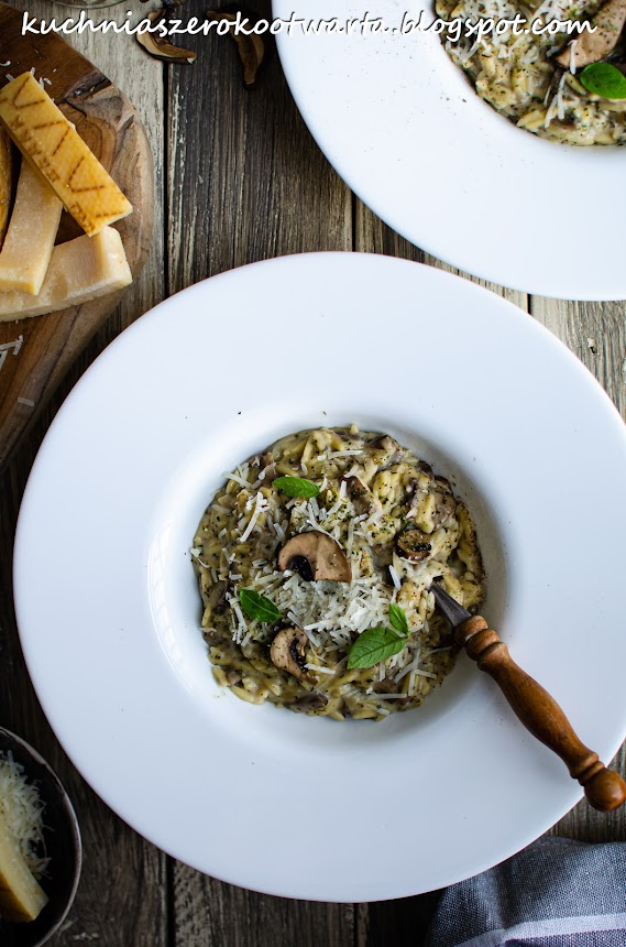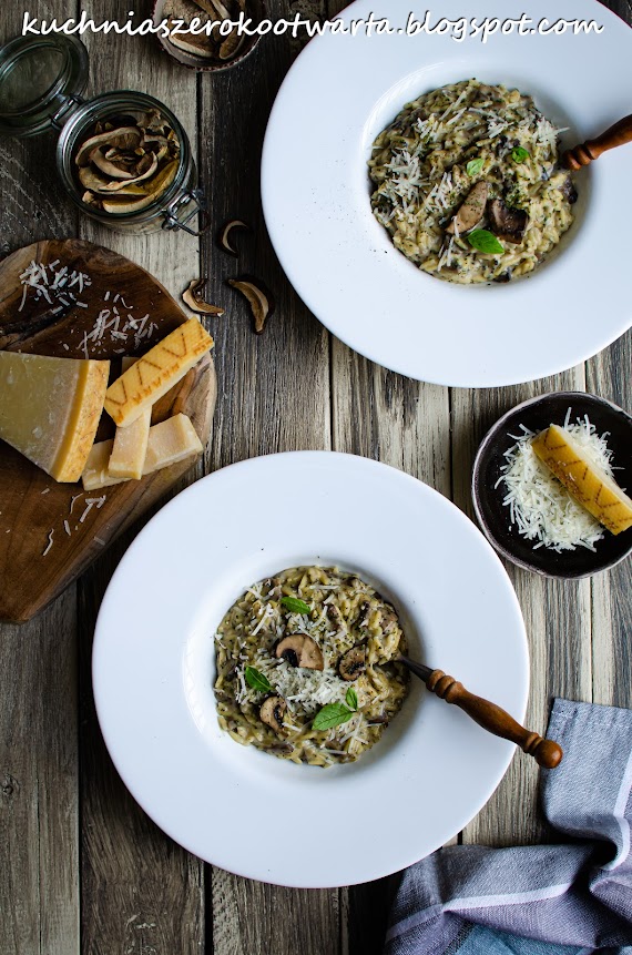 Pyszne, bajecznie kremowe danie jednogarnkowe wzorowane na klasycznym risotto, ale na bazie makaronu w kształcie ryżu. Dodatek zmielonych grzybów i pieczarek w połączeniu z kremową konsystencją, którą nadaje temu daniu masło, śmietana i grana padano tworzą prawdziwą ucztę dla podniebienia. Nie jest to danie z tych „fotogenicznych”, ale gwarantuję Wam, że zakochacie się w tym smaku 🙂 Dzięki temu, że ryż zastąpiony został makaronem, a suszone grzyby zmielone, danie przygotujecie w naprawdę ekspresowym tempie 🙂
