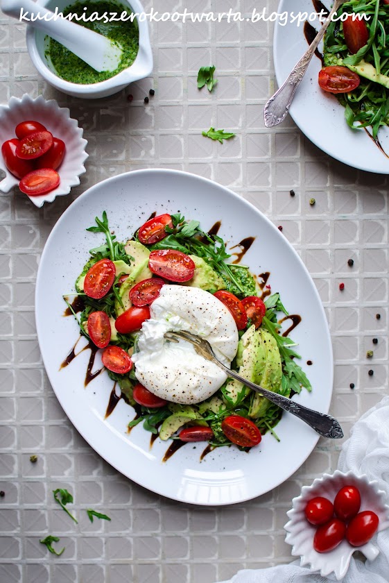 Wiosna! Wiosna w kalendarzu i na talerzu 😀 Dziś mam dla Was propozycję na pyszną, lekką, a zarazem pożywną sałatkę z serem burrata, awokado, pomidorkami i pesto z rukoli. Pyszne, śmietankowe wnętrze burraty idealnie komponuje się tutaj ze smakiem słodkich pomidorków, kremowym awokado i wyrazistym pesto. Zajadajcie na zdrowie 😉