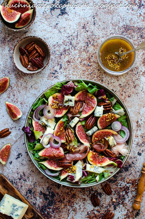Obłędna sałatka z figami, serem pleśniowym i szynką szwarcwaldzką to kompozycja smaków, która z pewnością Was zachwyci 🙂 Idealnie z pozostałymi składnikami współgra tutaj dressing miodowo-musztardowy. Sałatka jest mega szybka w przygotowaniu, więc z powodzeniem możecie przygotować ją jako posiłek do pracy czy szkoły 😉 Będzie pysznie 🙂