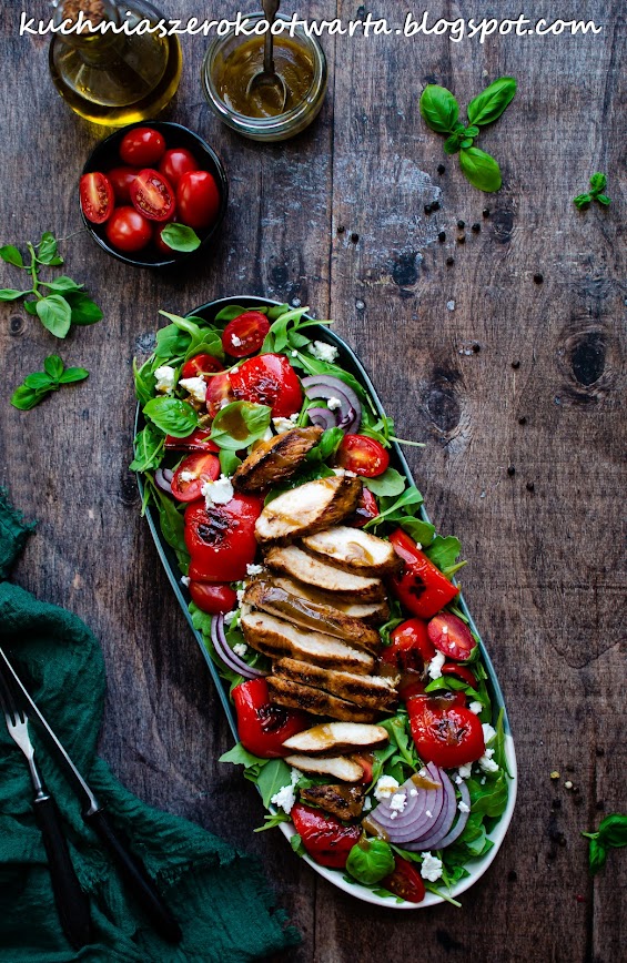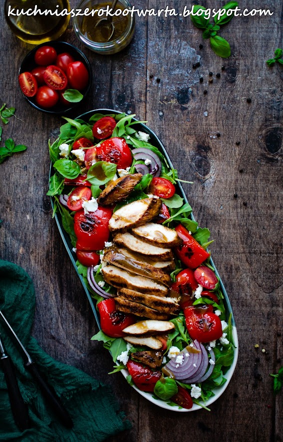 Pierś natrzeć marynatą i odstawić na minimum godzinę. Paprykę pozbawić gniazd nasiennych, pokroić na 8 części i polać łyżką oleju. Zamarynowaną pierś grillować z obydwu stron na złoty kolor. W międzyczasie posmarować pozostałą marynatą. Gotową pierś odstawić do przestygnięcia. Paprykę grillować z obydwu stron, do czasu, aż będzie lekko miękka, ale nadal chrupiąca. Rukolę ułożyć na talerzu, dodać przestudzoną paprykę, pokrojone pomidorki, pokrojoną w pióra cebulę oraz pokrojoną na plastry pierś z kurczaka. Całość posypać pokruszoną fetą i listkami bazylii. Składniki dressingu połączyć. Sałatkę polać dressingiem. Smacznego!