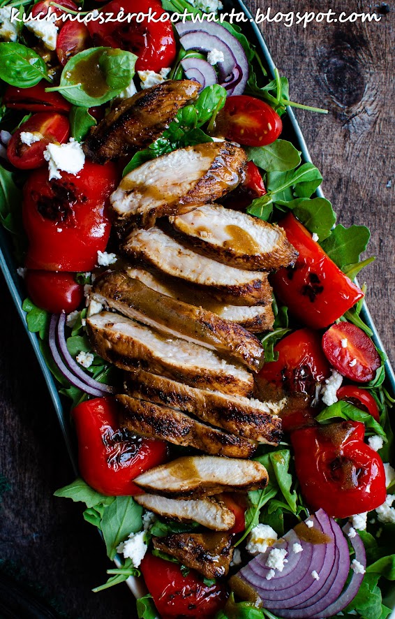 Obłędna sałatka z grillowaną piersią z kurczaka i papryką. Wyrazista w smaku, sycąca i bajecznie kolorowa 🙂 Pierś marynowana w sosie sojowym z dodatkiem miodu cudnie współgra tutaj ze słodkimi pomidorkami paprykowymi i serem feta. Całość polana dressingiem musztardowym tworzy prawdziwą ucztę dla podniebienia 😉 Sałatka jest bardzo pożywna, więc z powodzeniem zastąpi Wam obiad, szczególnie latem 😉