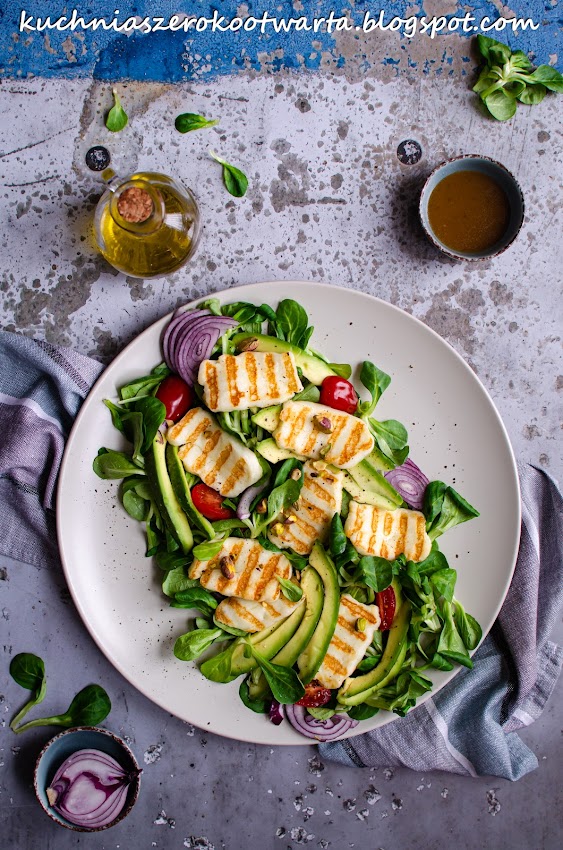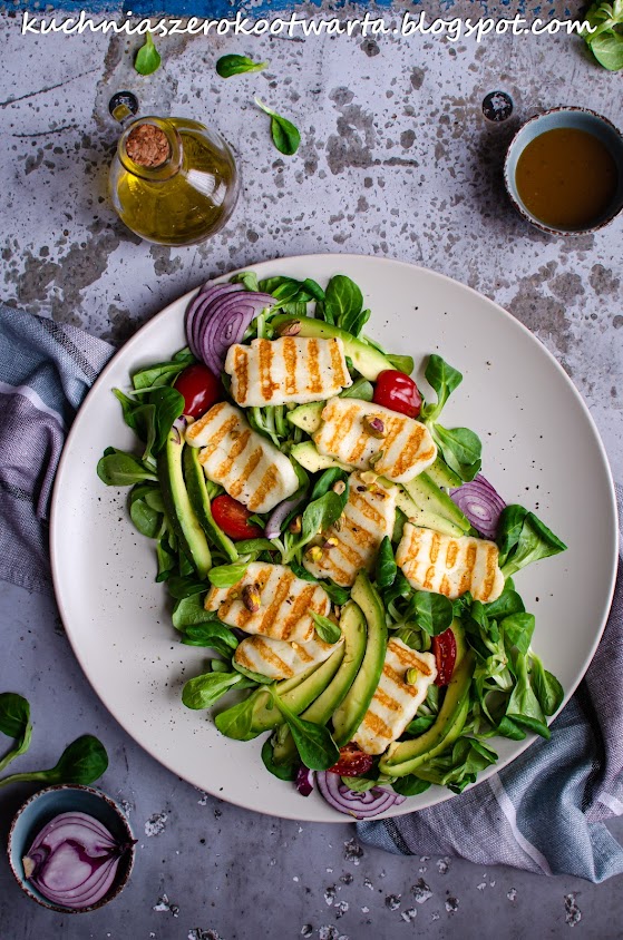 Halloumi odsączyć na ręczniku papierowym i pokroić na ok. 0,5 cm plastry. Posmarować oliwą i grillować z obu stron. Przełożyć na deskę i lekko wystudzić. Składniki dressingu połączyć. Roszponkę ułożyć na talerzu, dodać pokrojone na połówki pomidorki koktajlowe, pokrojoną w pióra cebulę i pokrojone na paski awokado. Na wierzchu ułożyć halloumi. Sałatkę posypać pistacjami i polać dressingiem. Smacznego!