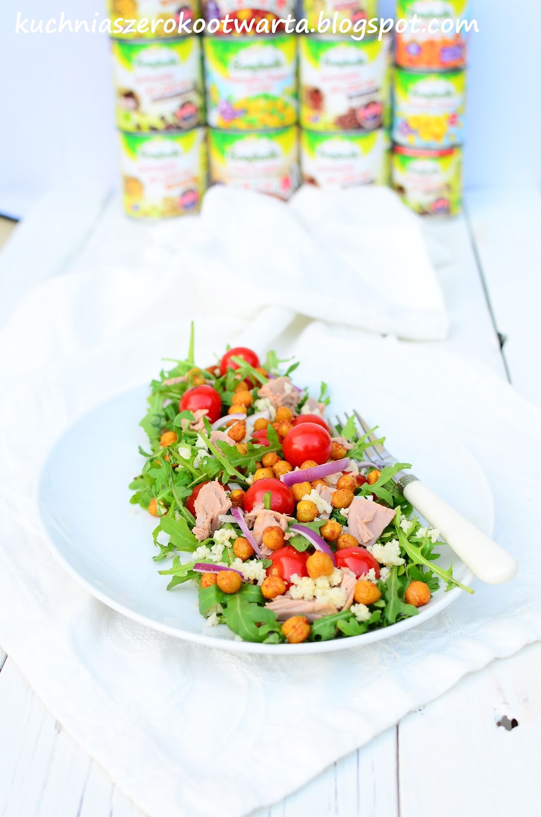 W letnie, gorące dni najlepszym posiłkiem są dla mnie lekkie, ale pożywne sałatki 🙂 Takie, których przygotowanie nie zajmuje dużo czasu, a dodatkowo dostarczają organizmowi sporej dawki energii i witamin. Pomysł na taką pyszną sałatkę zrodził się w mojej głowie kilka dni temu. Chrupiąca, pieczona ciecierzyca, słodkie pomidorki, pożywny tuńczyk i delikatna kasza kuskus połączone na jednym talerzu smakują przepysznie. Koniecznie spróbujcie 🙂