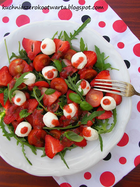 Rukolę ułożyć na talerzu. Dodać pokrojone na połówki pomidory koktajlowe, pokrojone na plasterki truskawki i kulki mozzarelli. Dodać kilka listków bazylii. Składniki dressingu zmiksować doprawić solą, pieprzem i cukrem. Sałatkę polać dressingiem i podawać od razu po przygotowaniu. Smacznego!