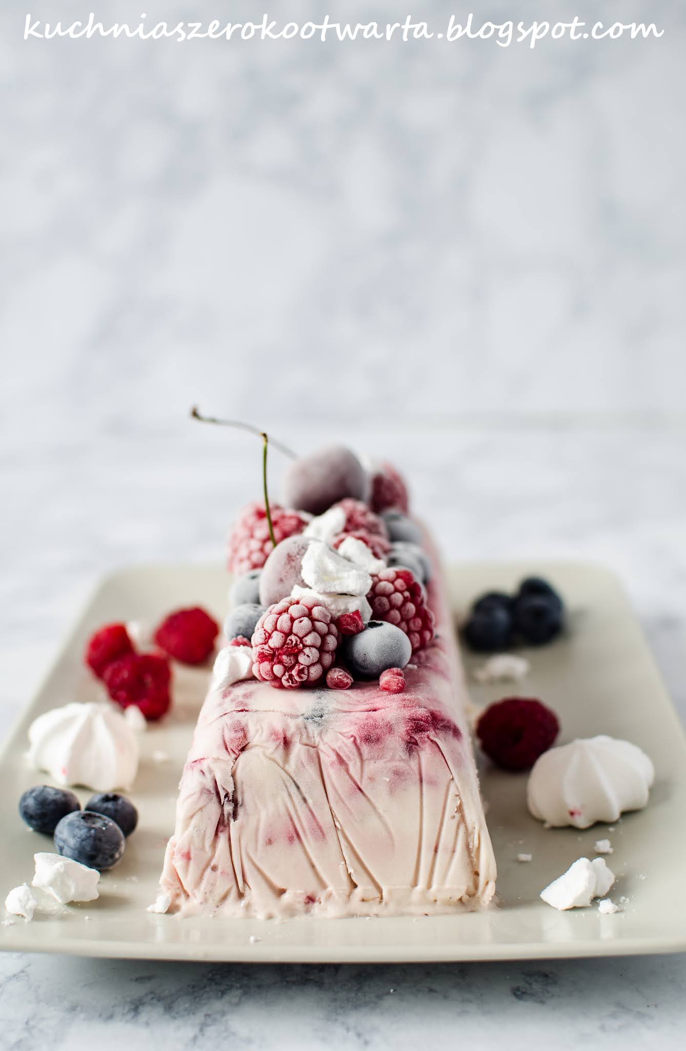 Semifreddo to włoski deser lodowy, w dosłownym tłumaczeniu oznacza „lekko zmrożony” i tak właśnie powinien być podawany. Przygotowuję się go podobnie do lodów z jajek, śmietany i cukru, jednak podczas mrożenia nie wymaga kilkukrotnego miksowania. Lekko rozmrożony ma bardzo kremową konsystencję. Możecie dodać do niego dowolne owoce. U mnie wersja z malinami i borówkami oraz pokruszonymi bezami 🙂 Było pysznie ;D