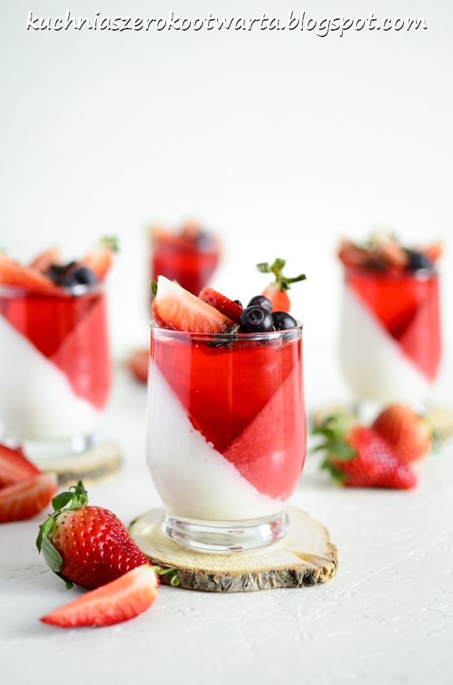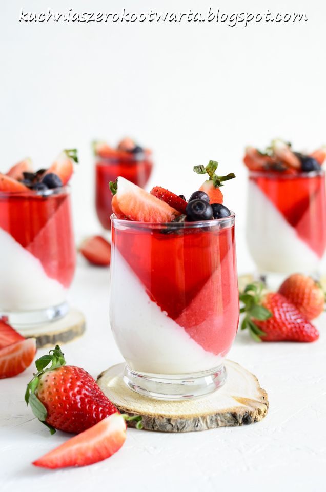 Żelatynę rozpuścić w gorącej wodzie i wystudzić. Ser zmiksować ze śmietaną i cukrem pudrem. Miksować stopniowo dolewając żelatynę. Masę serową przelać do szklanek. Szklanki wstawić do lodówki „pod skosem” i pozostawić do stężenia na ok. 1 godzinę. Truskawki zmiksować z cukrem, dodać rozpuszczoną w wodzie żelatynę i przelać do szklanek. Szklanki ustawić w lodówce „pod skosem” w drugą stronę. Galaretkę truskawkową rozpuścić w 400 ml gorącej wody, wystudzić i wlać do szklanek do pełna. Wstawić do lodówki do stężenia. Przed podaniem deser udekorować truskawkami, borówkami oraz posiekaną czekoladą. Smacznego!