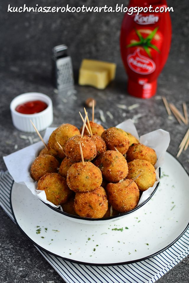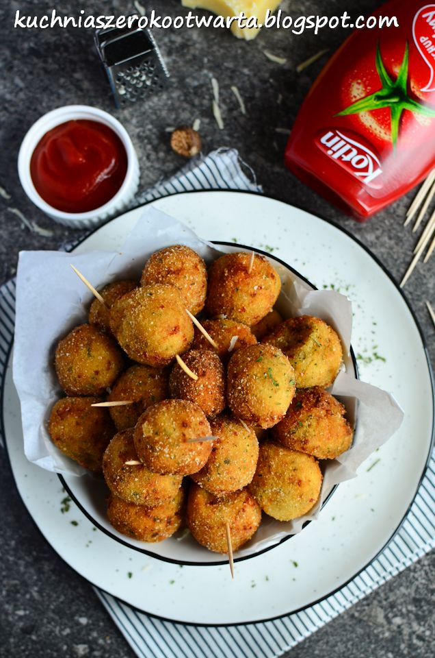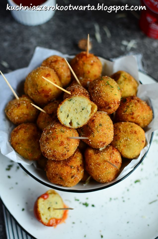 Proste w przygotowaniu, chrupiące z zewnątrz i mięciutkie w środku kulki ziemniaczane z parmezanem i ziołami to świetna propozycja na imprezową przekąskę lub dodatek do drugiego dania. Najlepiej smakują tuż po upieczeniu z pikantnym ketchupem 🙂 Jednak z powodzeniem możecie zaserwować je także na zimno. Aromat ziół, lekko pikantny smak chili i czosnku nadają tym złotym kuleczkom niesamowitego charakteru. To także dobry patent na wykorzystanie ziemniaków z poprzedniego dnia. Tania i prosta przekąska, która z pewnością zrobi wrażenie na gościach. Zapewniam Was, że będzie pysznie 🙂